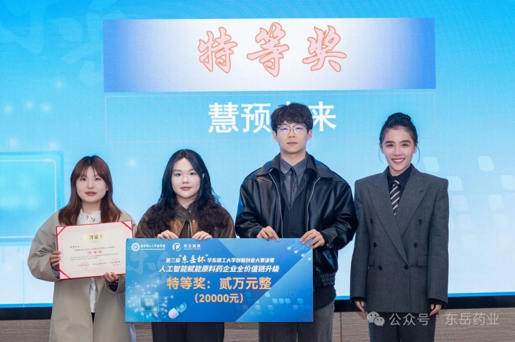据了解,第三届“东岳杯”华东理工大学创新创业大赛不仅注重培养学生解决复杂商业问题的能力,更致力于推动产教融合,培育懂技术、善谋划的复合型人才,以智慧创新为医药行业转型升级注入新动能。本次大赛精彩纷呈,共产生特等奖1名、一等奖2名、二等奖3名、三等奖6名、优胜奖2名。