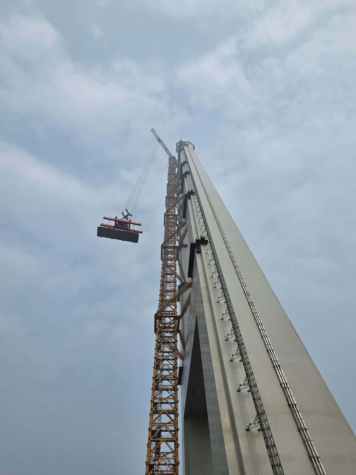 本次吊装的主索鞍总成重达958吨,在350米高塔顶精准安装。施工团队采用模块化吊装与三维定位技术,配合高精度监测,将姿态偏差控制在毫米级,为大桥主缆架设奠定了坚实基础。南航道桥主索鞍为世界首创自行走滚轴式结构,摩擦系数控制在千分之一,平整度达0.3毫米,可降低塔底弯矩约25%,为超大跨径桥梁结构优化提供了全新方案。