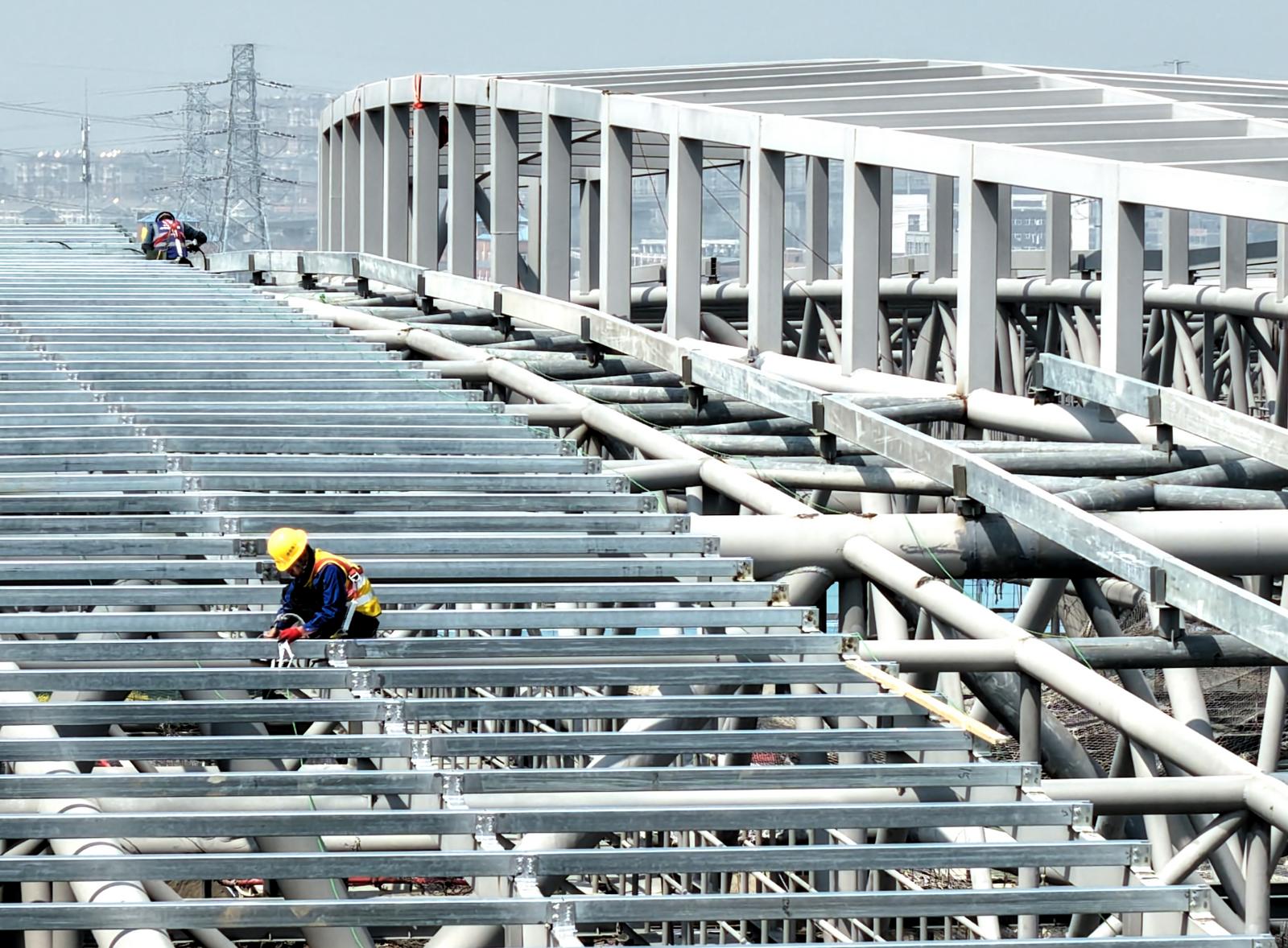 2026年4月2日,中铁建工集团数百名工人正在高空中进行金属屋面及幕墙施工。连日来,北沿江高铁新建南通站站房及相关工程施工现场一片繁忙。