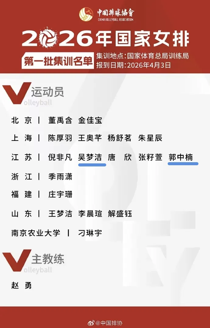 2025/2026赛季全国女排超级联赛于1日晚落幕,代表江苏队参赛的吴梦洁、郭中楠凭借联赛期间的不俗表现进入国家女排今年首期集训名单。本赛季联赛,吴梦洁成为江苏队最主要的进攻点,她经常在一场比赛中为江苏队夺得二三十分,1日举行的联赛闭幕式上被评为本赛季最佳主攻手。首次参加联赛的郭中楠表现出和年龄不相符的成熟和实力,出生于2009年的她多次出现在江苏队首发阵容,她的快攻和拦网均表现出不俗实力,成为本届联赛最耀眼的新星之一,此次她入选中国女排集训名单,成为第一位敲开成年组国家队大门的05后南通运动员。