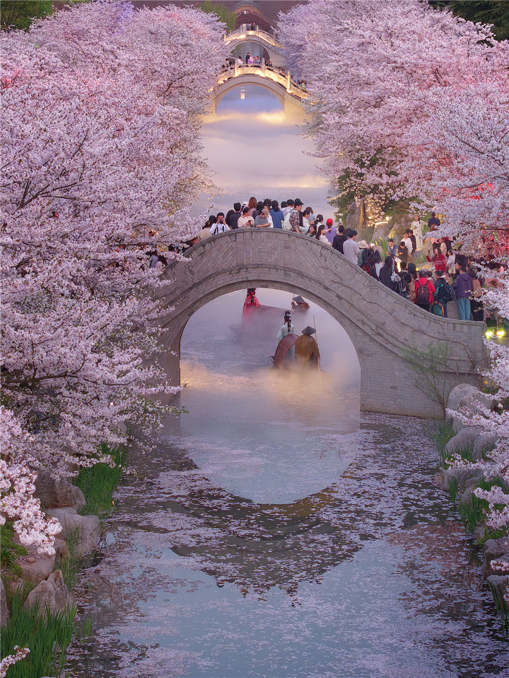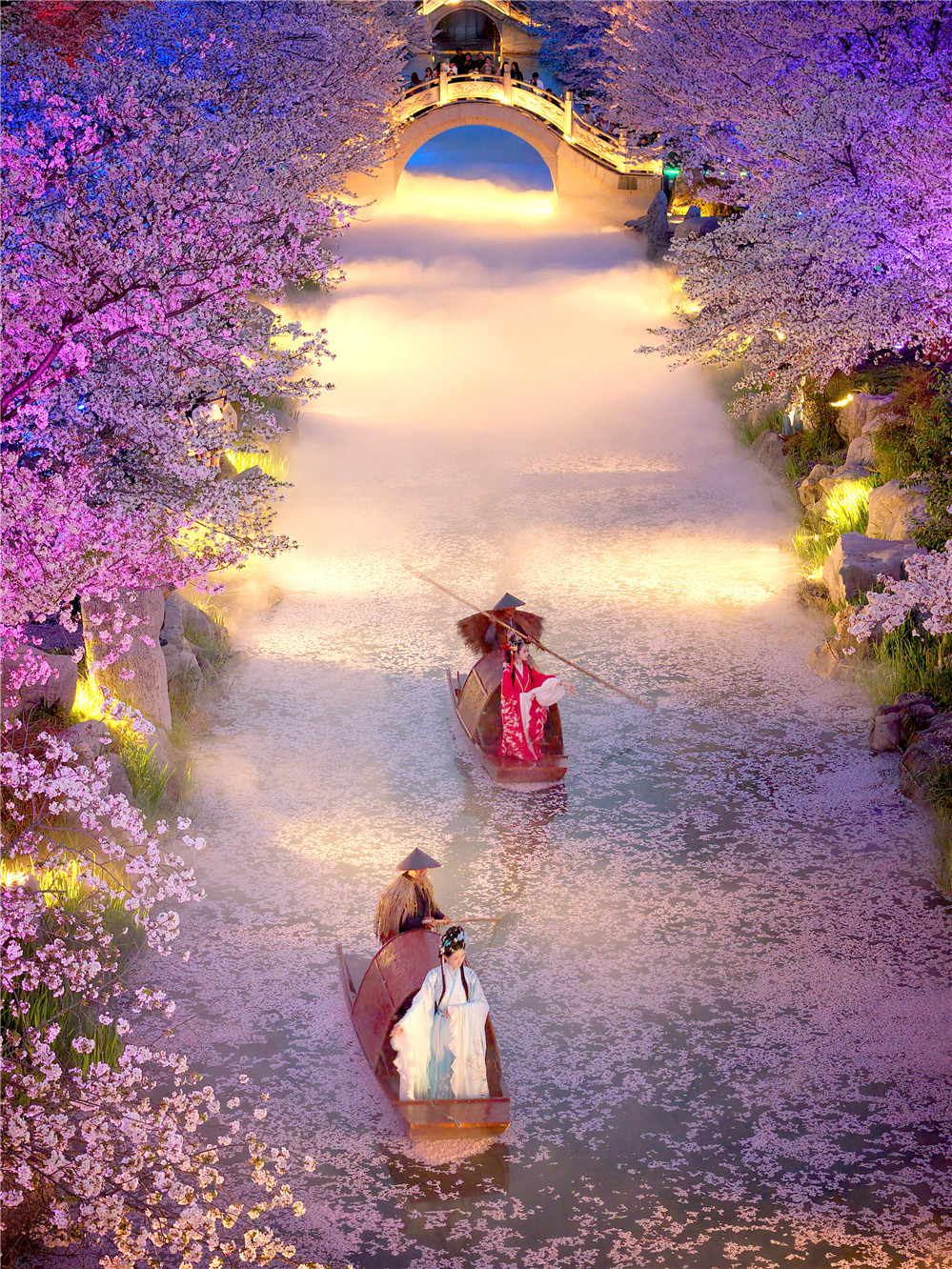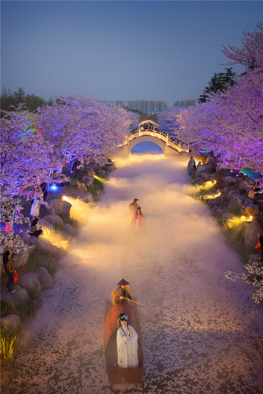 2026年4月5日晚,众多游客在位于通州区五接镇的洲际梦幻岛赏花、拍摄美丽夜景和灯光秀。