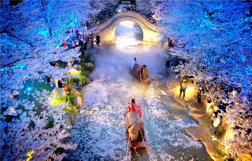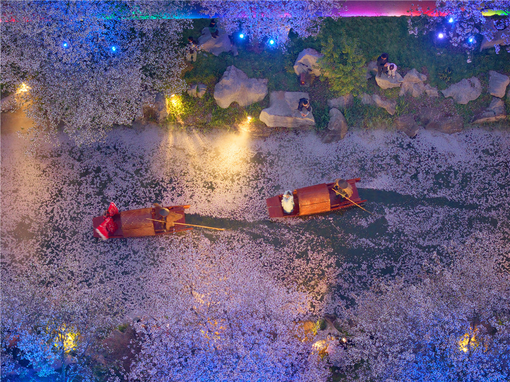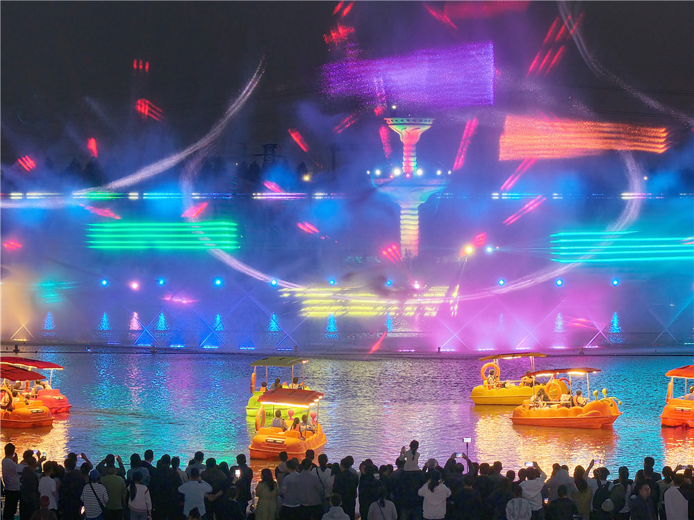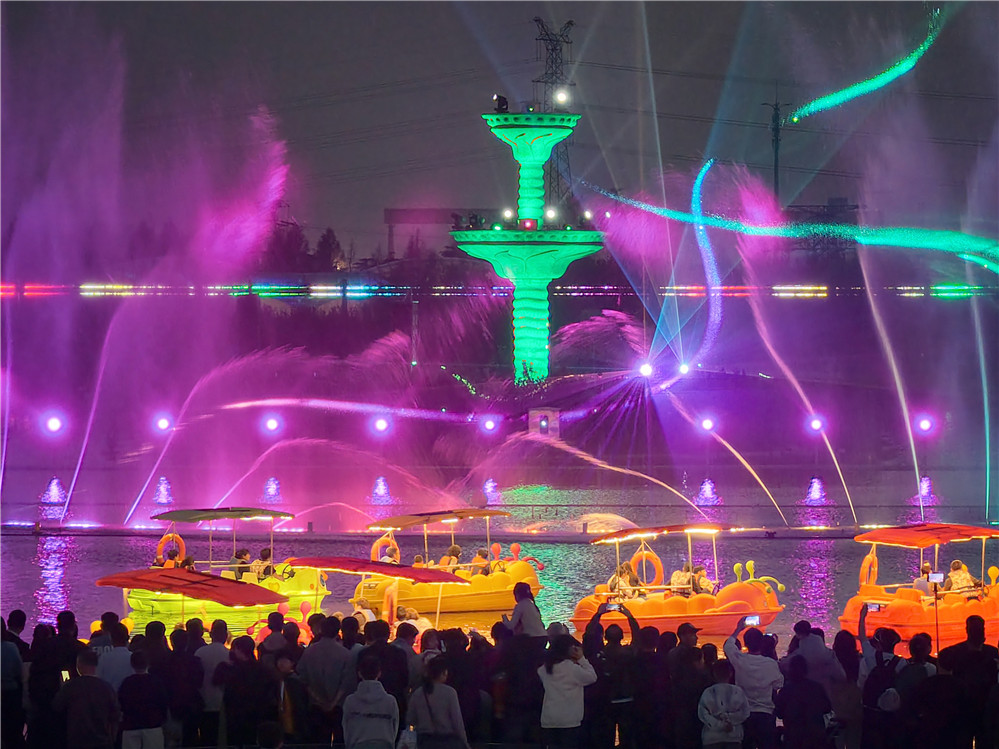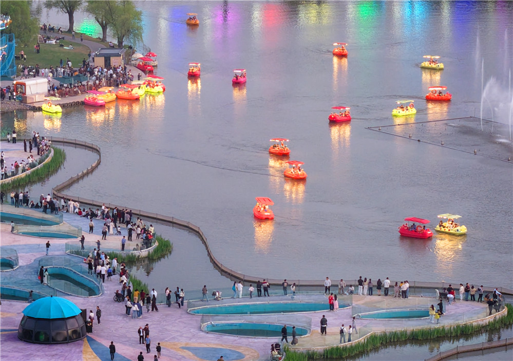 2026年4月5日晚,众多游客在位于通州区五接镇的洲际梦幻岛赏花、拍摄美丽夜景和灯光秀。