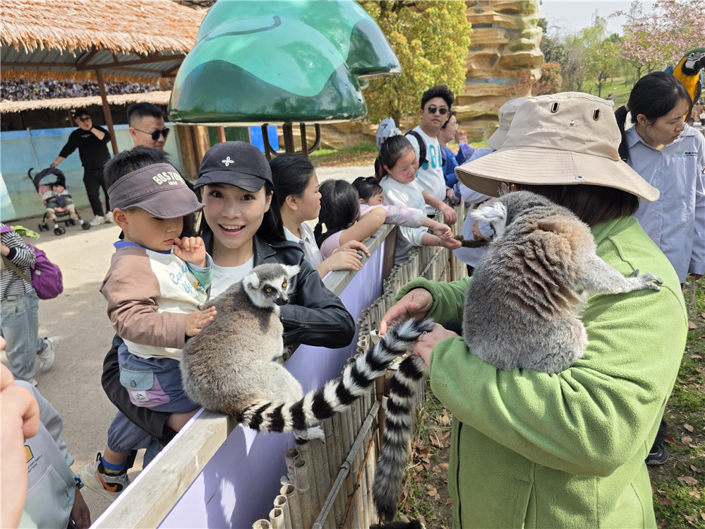 2026年4月5日,众多游客在南通森林野生动物园与动物近距离接触、观看丰富多彩的演出。江苏春假和清明假期,南通森林野生动物园入园人数超10万人。