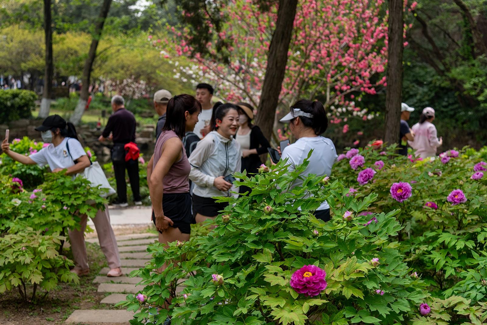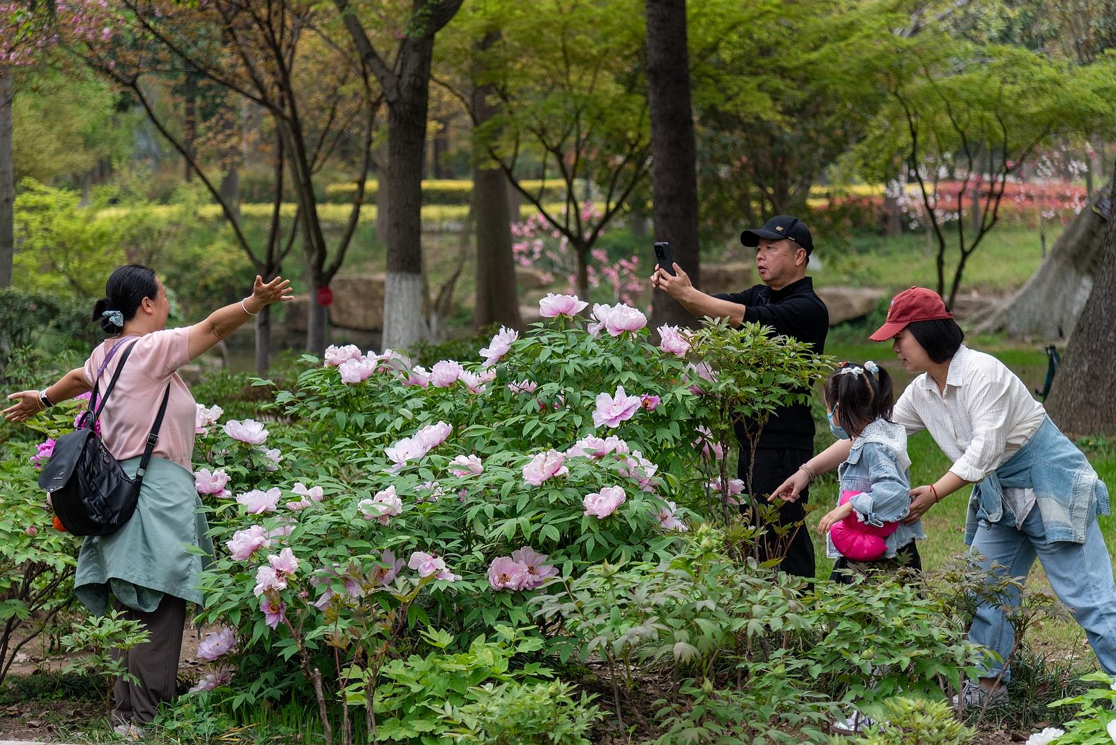 花开紫琅,香满北麓。漫步狼山北麓园和入山之门,牡丹花开正艳,姚黄、魏紫、赵粉等名贵品种竞相绽放,雍容华贵、暗香浮动。粉白、嫣红、嫩黄的牡丹与河边灼灼桃花相映成趣,一步一景皆是诗情画意,游人穿梭花间,拍照打卡、驻足赏味,尽享春日美好。