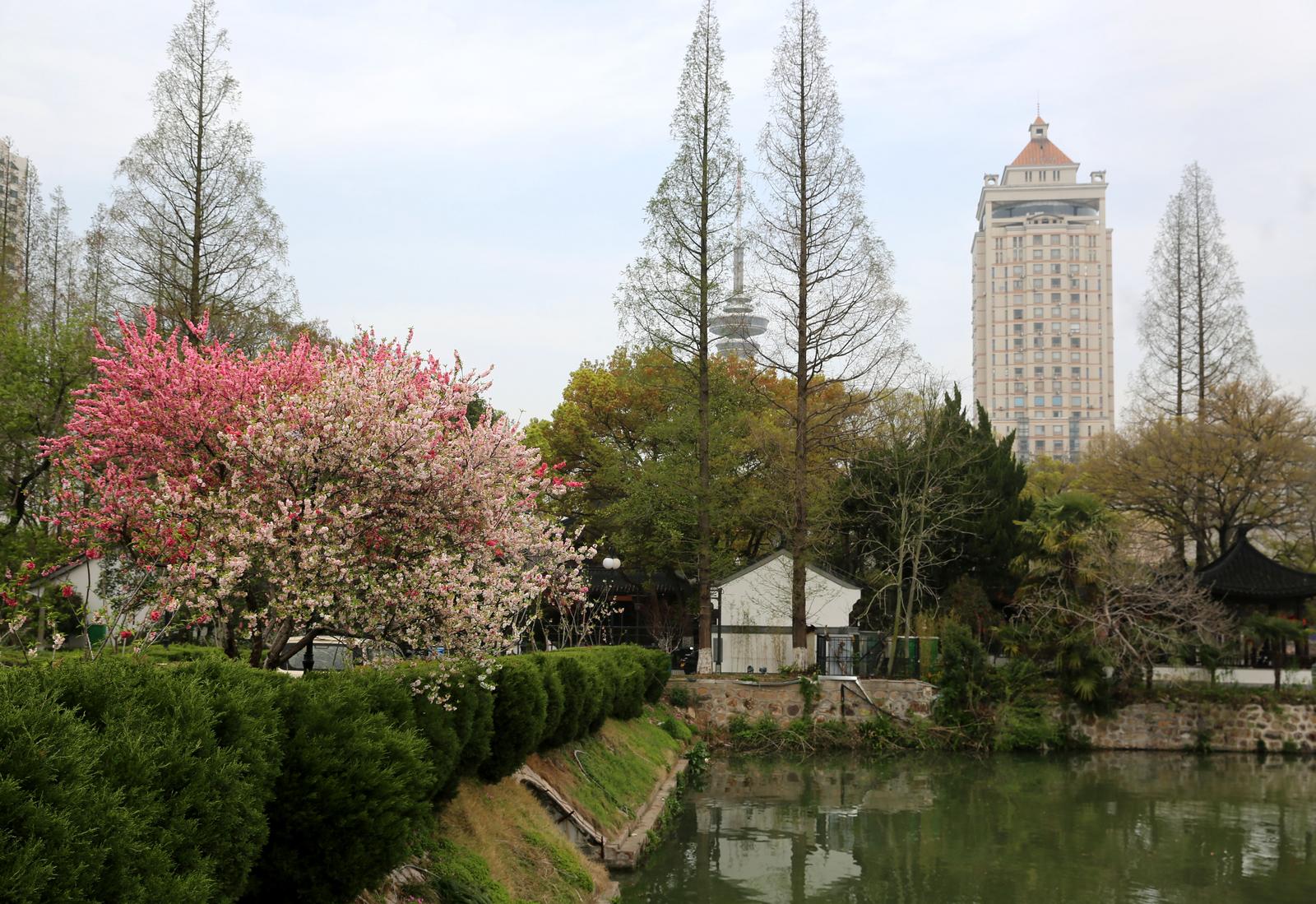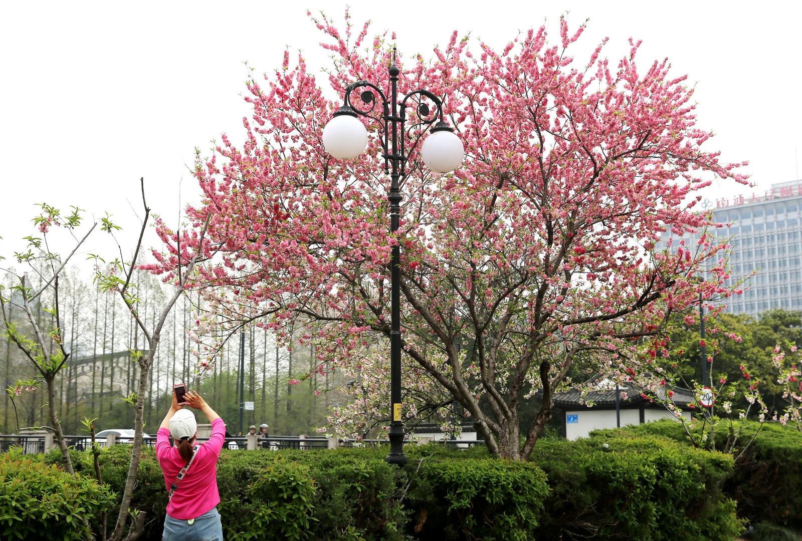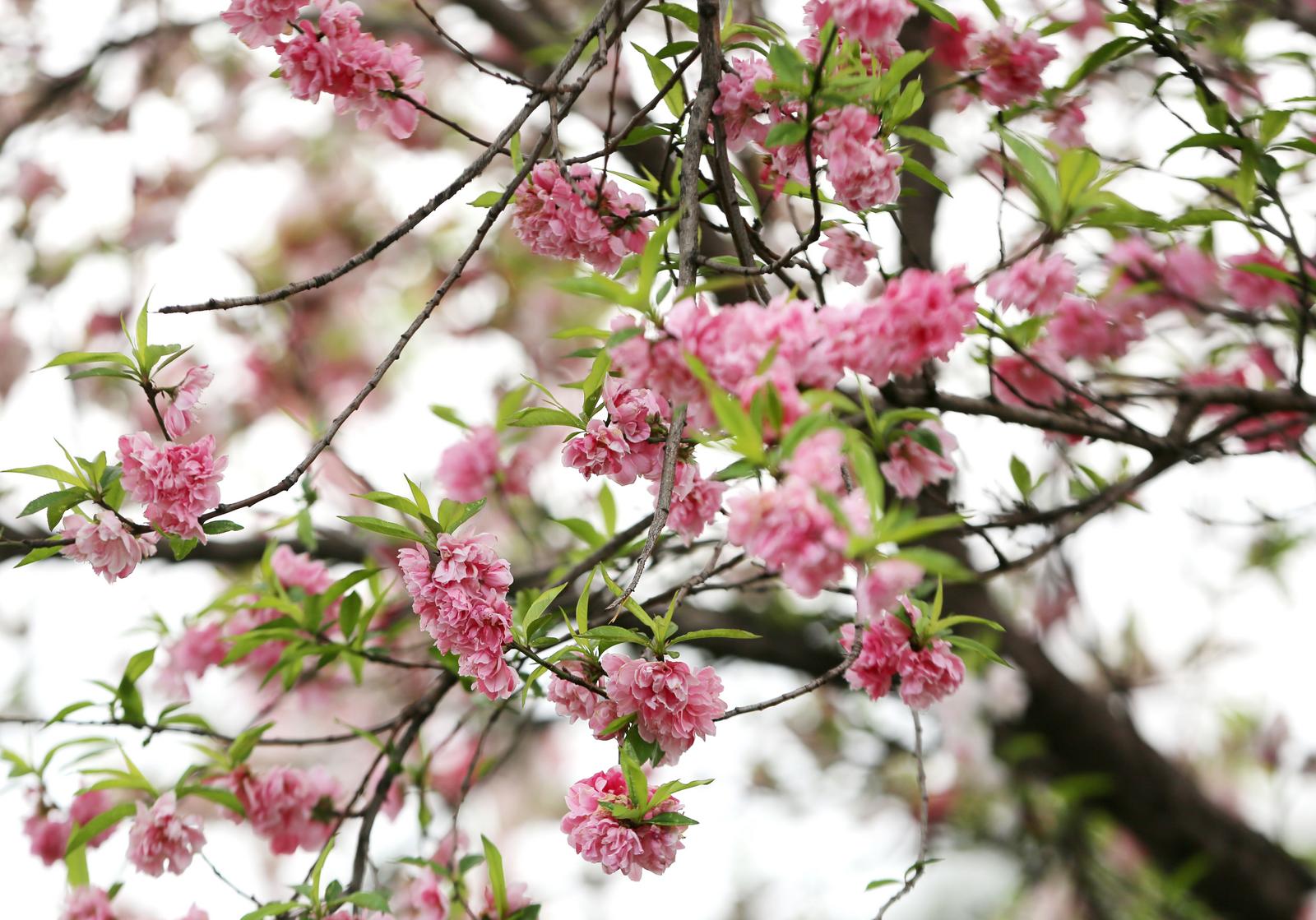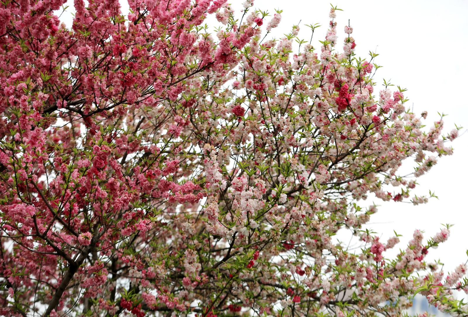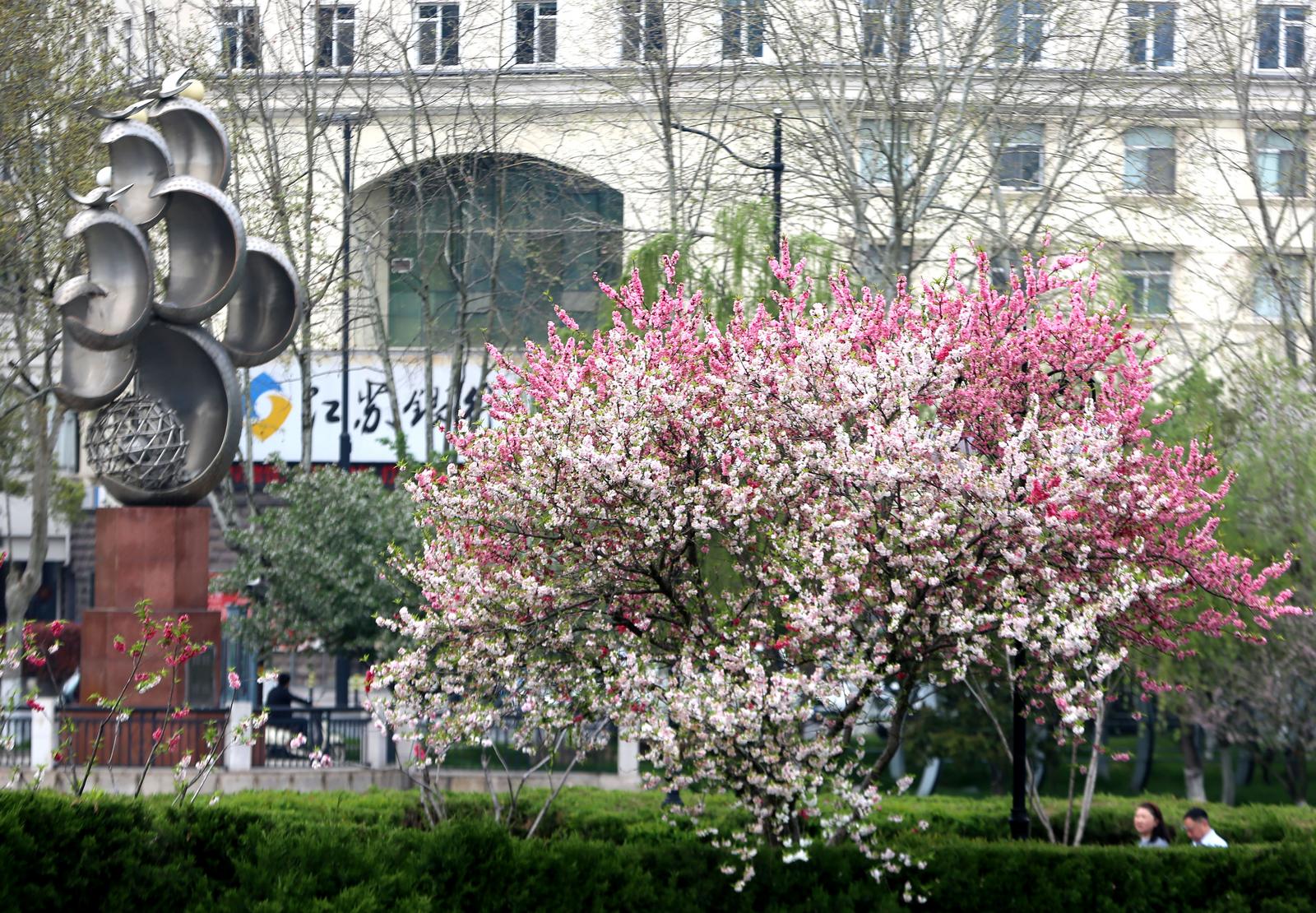 中公园门口三色碧桃盛放,成市民春日打卡点