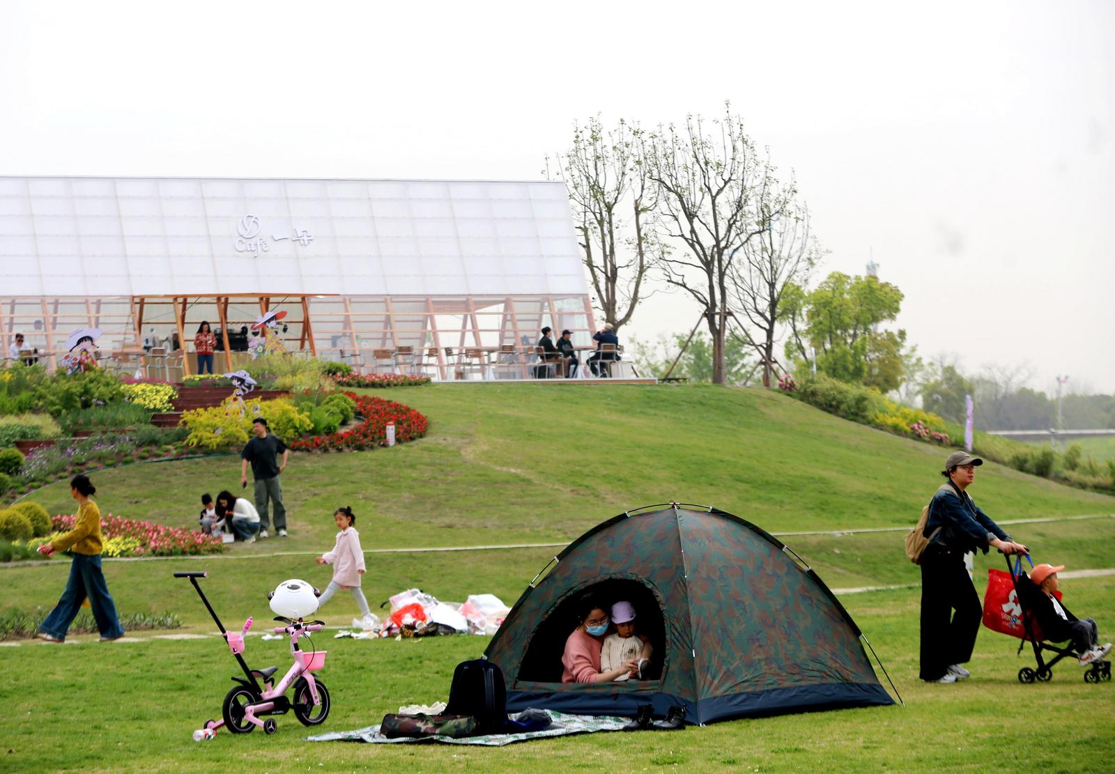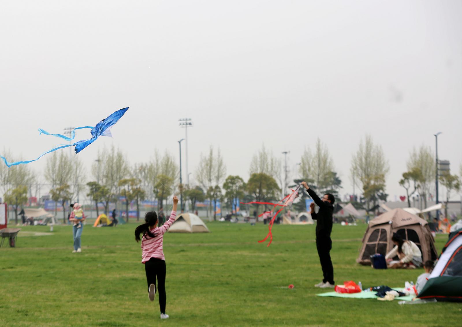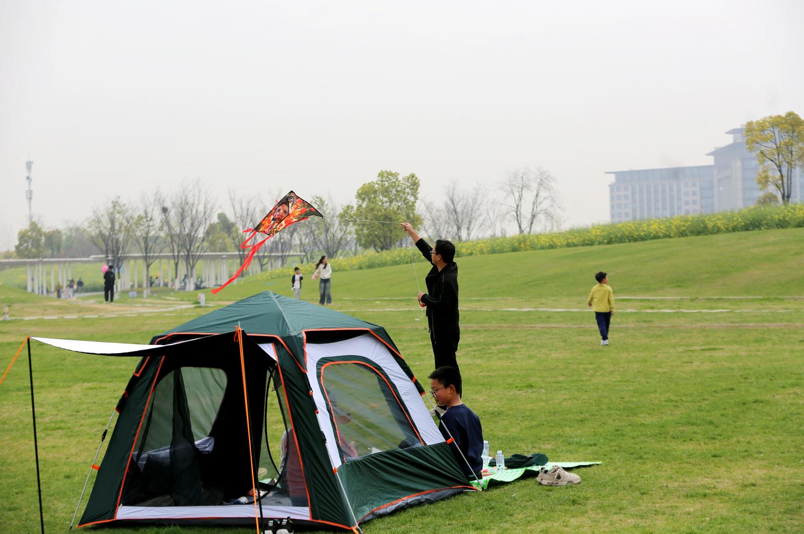 4月6日,市民朋友在滨江花海踏青休闲,草坪上帐篷错落搭建,尽享惬意时光。天空中,各式风筝迎风飞舞;场地间,有人挥拍打起羽毛球,欢声笑语不断。