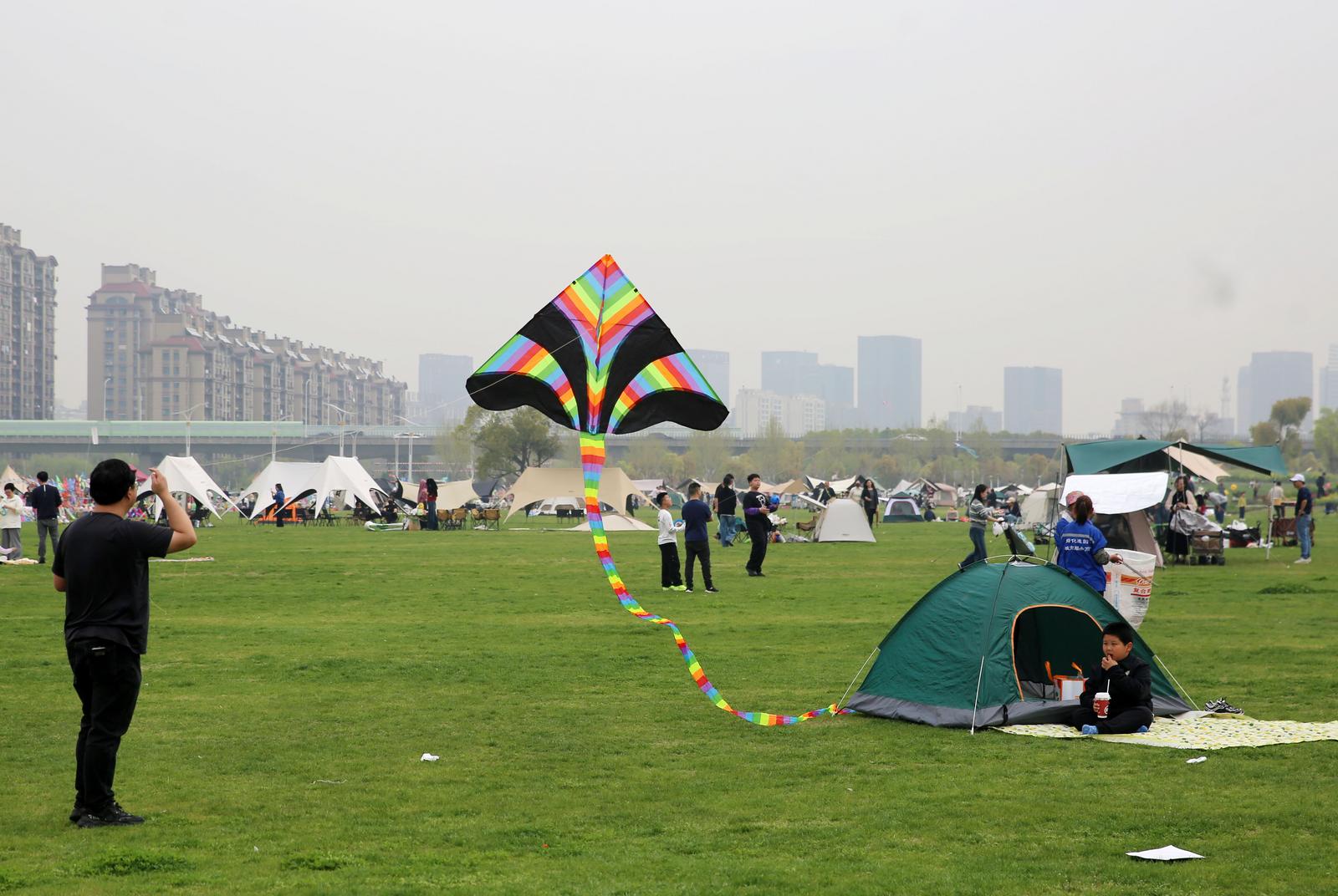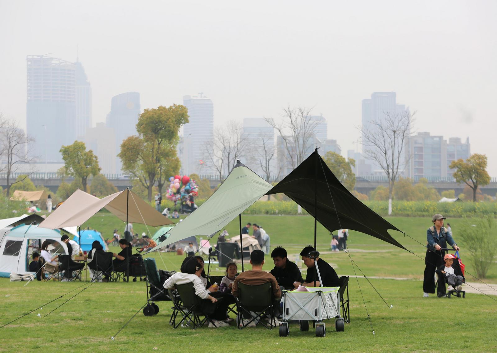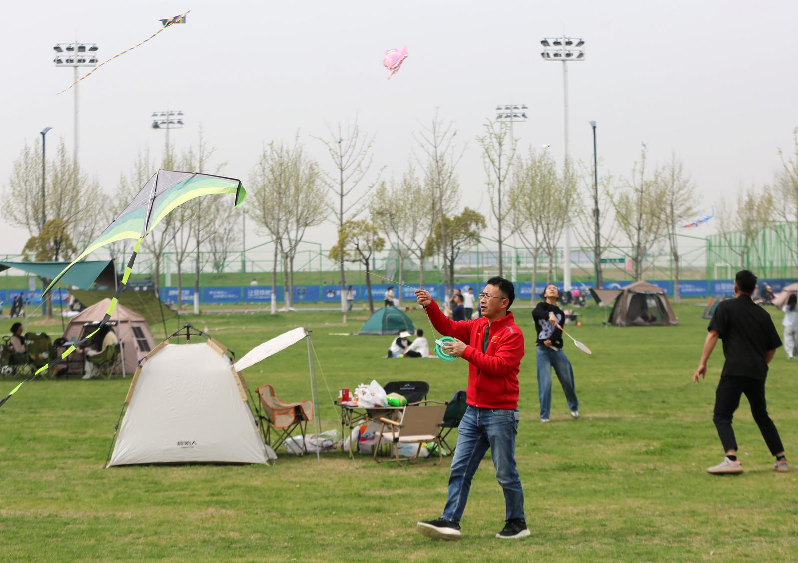4月6日,市民朋友在滨江花海踏青休闲,草坪上帐篷错落搭建,尽享惬意时光。天空中,各式风筝迎风飞舞;场地间,有人挥拍打起羽毛球,欢声笑语不断。