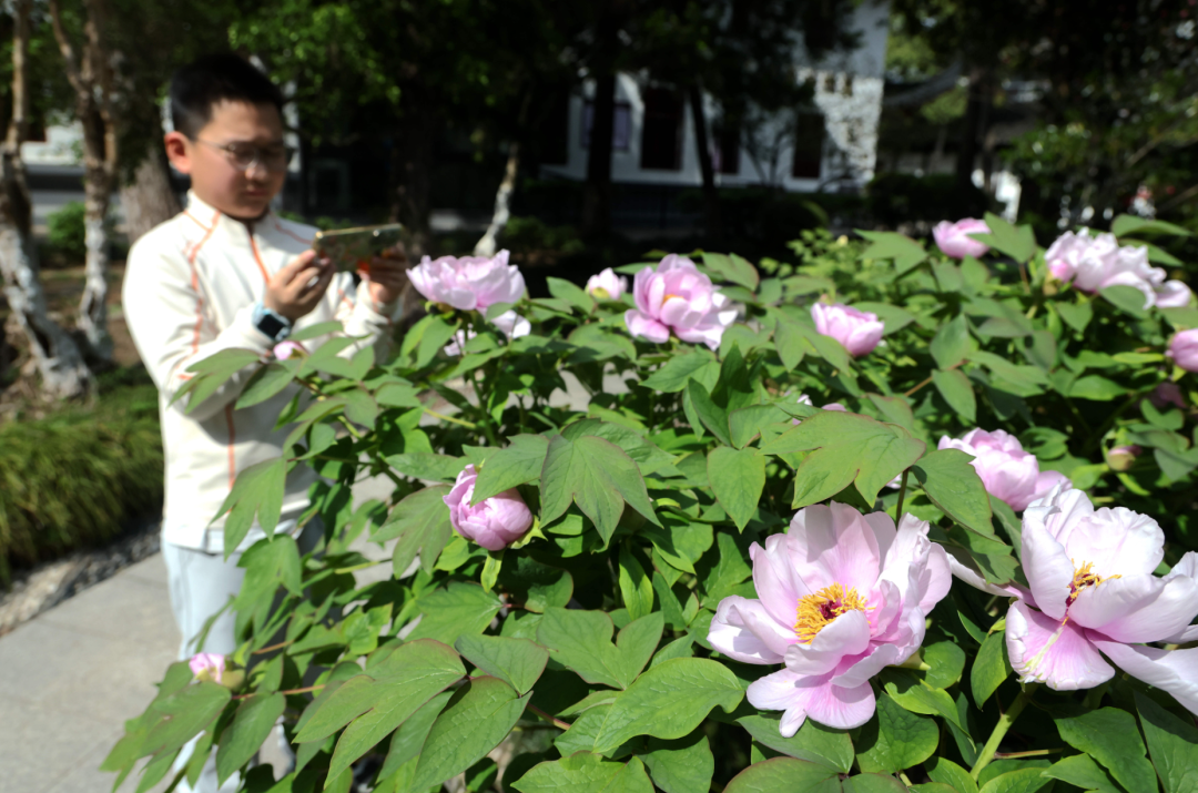 狼山景区北麓园,第十二届牡丹节正热。不少家长带着孩子在牡丹园里辨认品种,一边赏花一边听讲解员讲述张謇当年引种牡丹的往事。