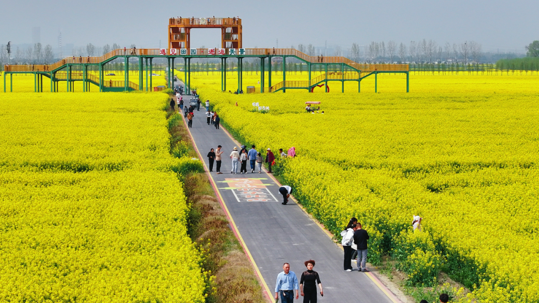 如皋平园池村千亩油菜花与碧绿麦田相映成趣,游客在花海里放风筝、骑观光车,笑声洒了一路。