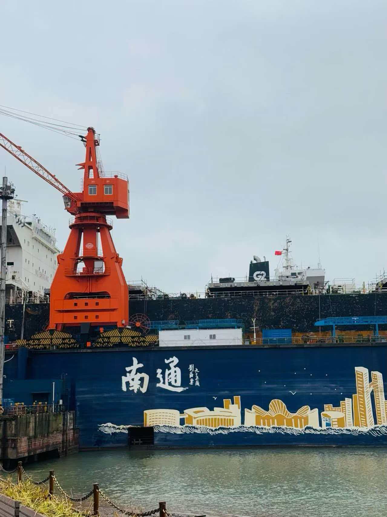 在海洋工程博物馆馆长施伟林的带领下,同学们首先来到码头,眼前的15万吨级浮船坞如同一座“海上钢铁城堡”,蓝色的坞体上“南通”二字格外醒目,旁边的红色岸吊高耸入云,与远处的巨轮交相辉映,构成了一幅震撼人心的工业画卷。技术人员详细介绍了浮船坞的构造原理、作业流程以及在船舶修理与建造中的关键作用,从“如何托举巨轮”到“如何精准对接”,每一个细节都让同学们惊叹于现代船舶工业的精密与宏大。