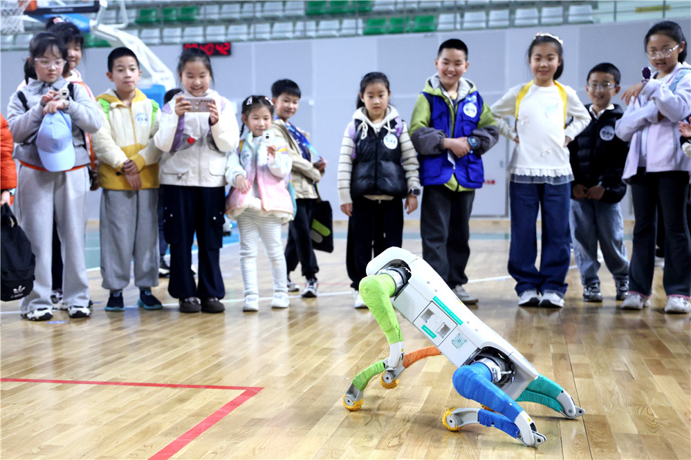 两只智能机器狗灵活跳跃、翻转打滚;体感机械手、VR眼镜等前沿设备轮番亮相,引得小观众们惊呼连连。2日,来自全市多所小学的近百名江海小记者走进南通大学啬园校区,开启“一日AI探索之旅”——体验VR场景化项目、参加科学互动实验、进行无人机试飞比赛等。“孩子从小就对科学感兴趣,看到通大有研学活动,兴奋得不得了,主动要求报名。”启东实验小学小记者朱子骞的家长说。启东市桂林小学的小记者程祥五也直呼“大开眼界”:“第一次亲眼看到机器狗完成后空翻,特别震撼!”