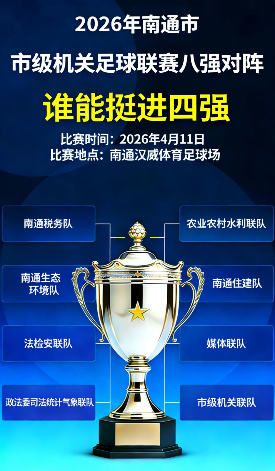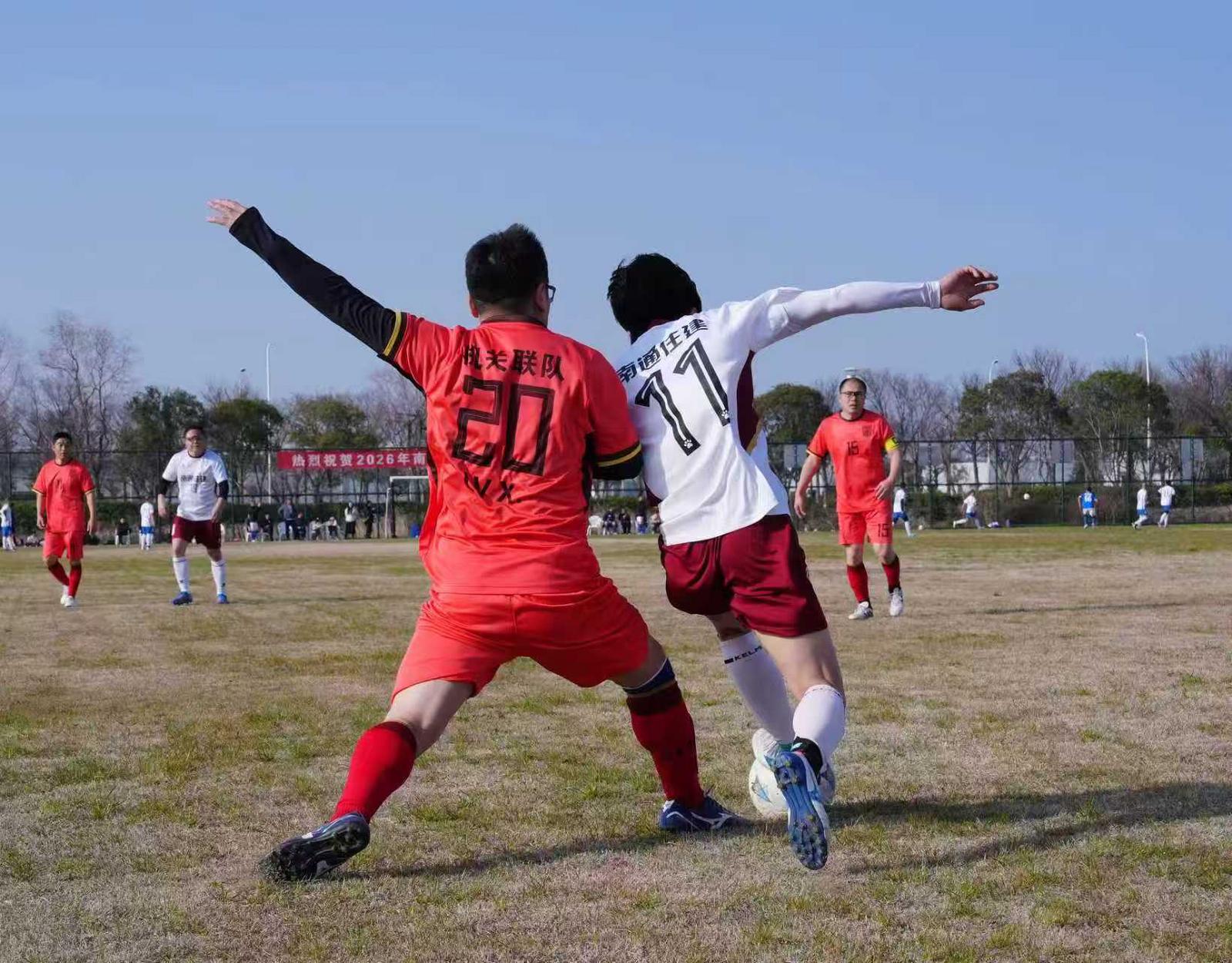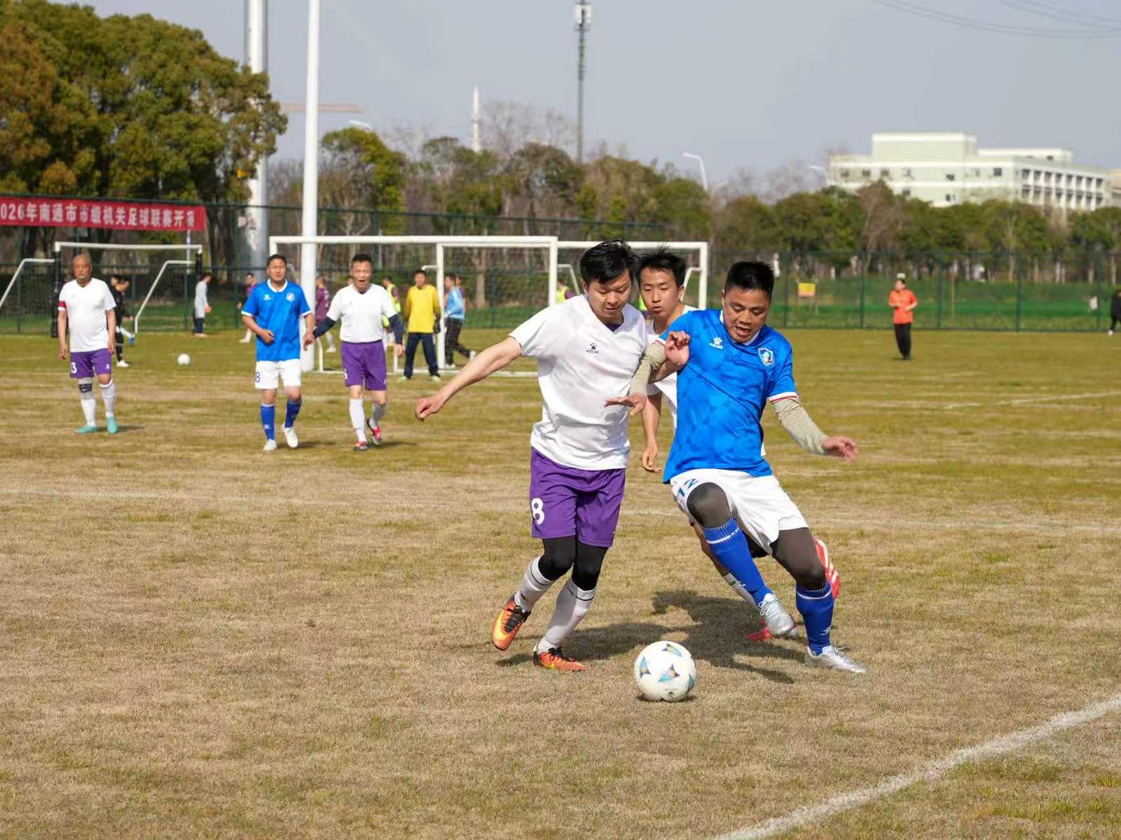 战鼓再擂,绿茵逐鹿!4月11日,2026年南通市市级机关足球联赛八强交叉赛正式开战。历经三轮小组赛鏖战,南通税务队、生态环境队等8支队伍成功突围,即将在南通汉威体育足球场展开强强对话,向四强席位发起冲击。同日,2026年江苏省城市足球联赛新赛季揭幕,本土足球热潮同步升温,机关联赛与职业赛场同频共振,共同为南通足球、江苏足球喝彩。