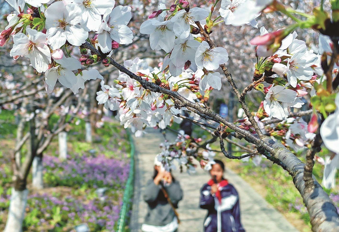 春季来临,阳光明媚。通吕绿廊里的早樱次第绽放,吸引市民纷纷走出家门,前来休闲、拍照、游玩,尽情享受惬意的柳绿樱粉。
