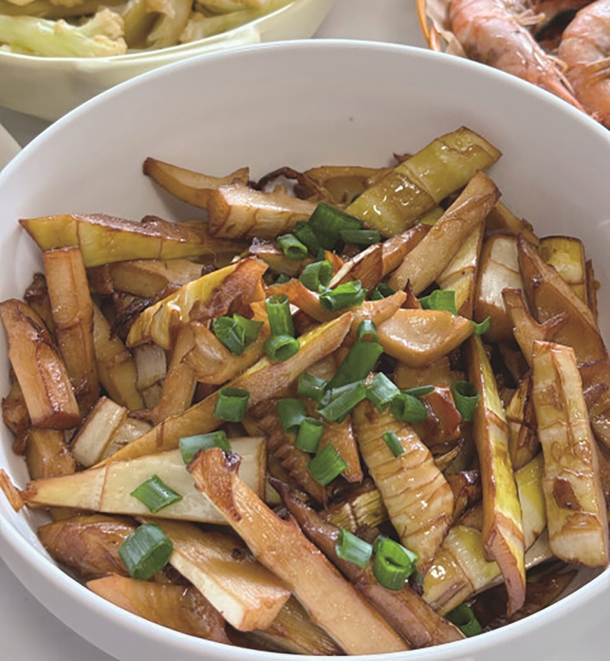 春笋要挑清明前后出土的,极嫩。将其从根部切开,再对半掰开,剥出完整的嫩笋。切块、焯水、放油,用冰糖炒出糖色,倒入笋翻炒,再加生抽、老抽、白糖和水焖煮。收汁后盛出,撒上香葱装饰一下。至此,一道色香味俱全的油焖笋就做好了。其色泽红亮、脆嫩爽口,咸鲜中带有甜味,伴着热气腾腾的锅气吃一口春笋,质地柔软,口感细腻,透过浓重的调料还能品尝到春笋自有的清新淡雅。搭配一碗大米饭,用勺子舀一点汤汁和上米饭,让每一粒米都包裹上浓郁的汤汁,吸满了油和调料的精华以及春笋的清香,一口接一口,根本停不下来。