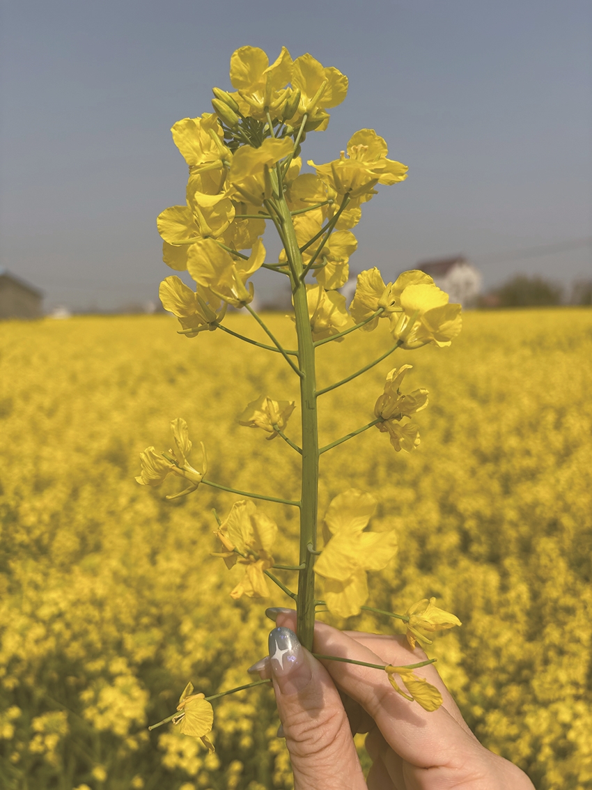 回婆家的路上,喜见一片片金灿灿的油菜花迎风招展,俨然铺开了十里金色花海,十分惊艳,必须拍照发圈嘚瑟一下。刚发完圈,就看到慧姐高举着一小束油菜花,喊着:“猜猜这是什么花?”