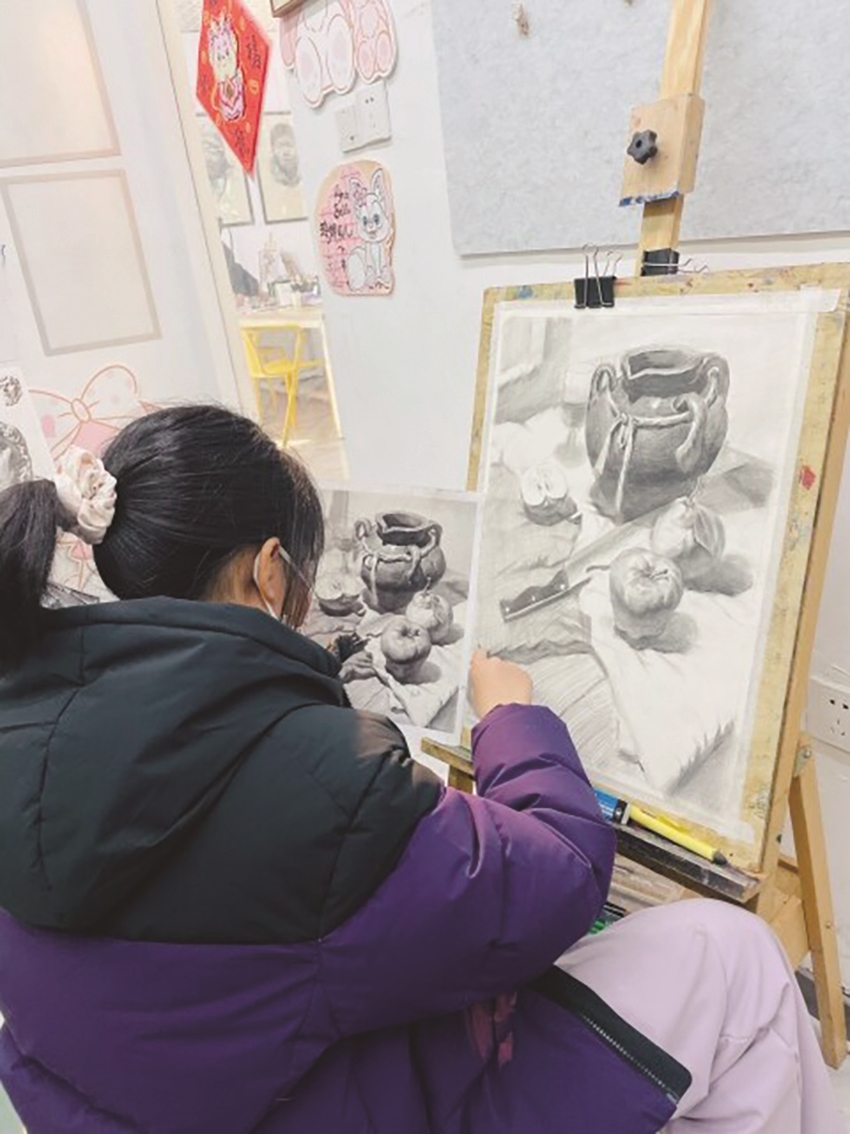 记得刚开始学素描时,她烦躁得很,橡皮用得比铅笔快。排线排不好,急得要哭;透视画不准,摔过笔。但每次我说“要不歇歇”,她都说“我再试试”。不知道从哪天起,那些线条开始听话了,明暗交界线有了过渡,高光真的亮了起来。她画的第一组静物是一个陶罐和一个苹果。画完了举着给我看,眼睛亮晶晶的。我其实看不出好坏,但我看见她手指上沾满了铅灰,看见她终于画出了自己想要的东西。