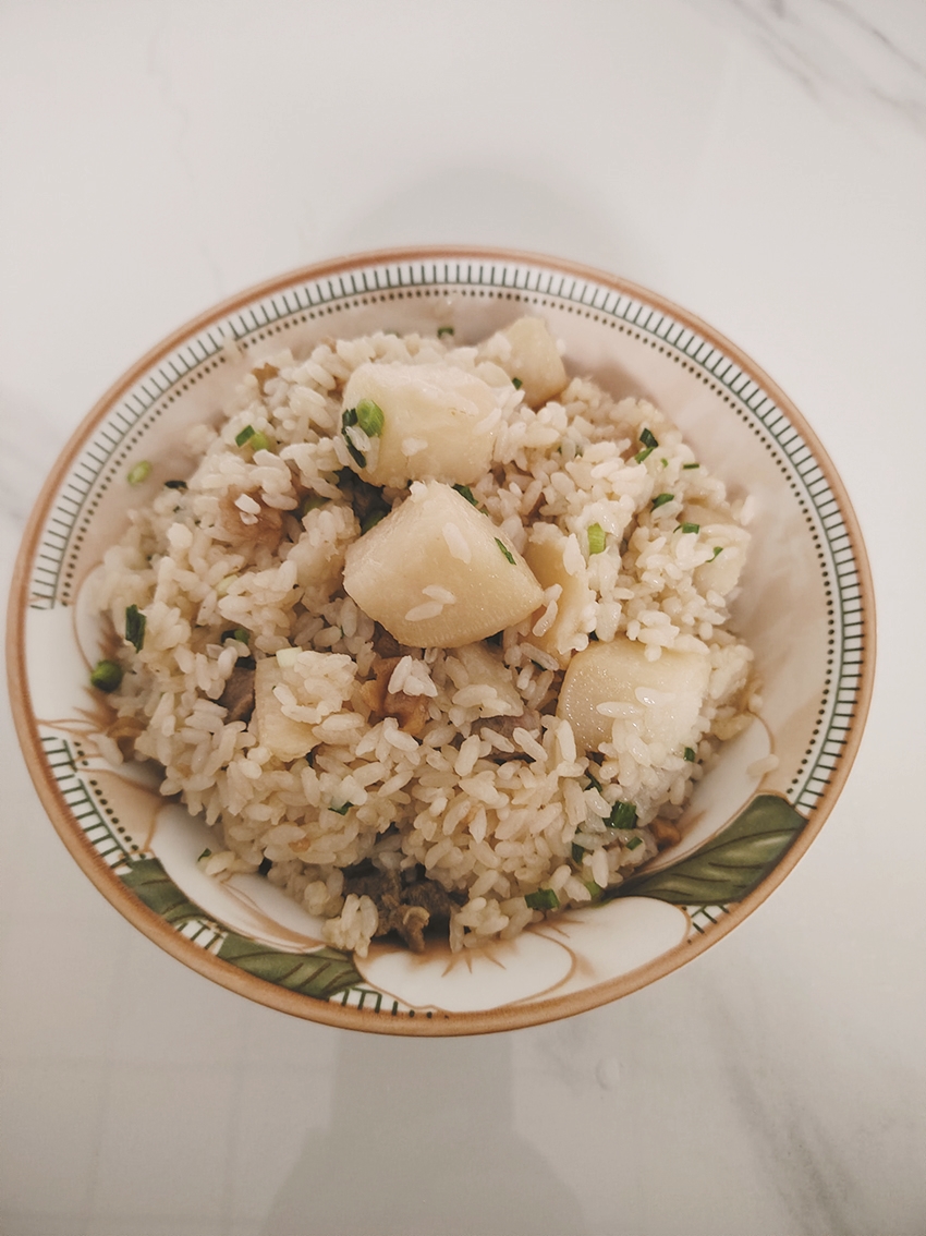 现在生活好了,我自己做大头菜饭会加点肉丁、生抽,出锅撒把葱花,味道更鲜了。可我总忘不了小时候那碗什么都不加的大头菜饭。