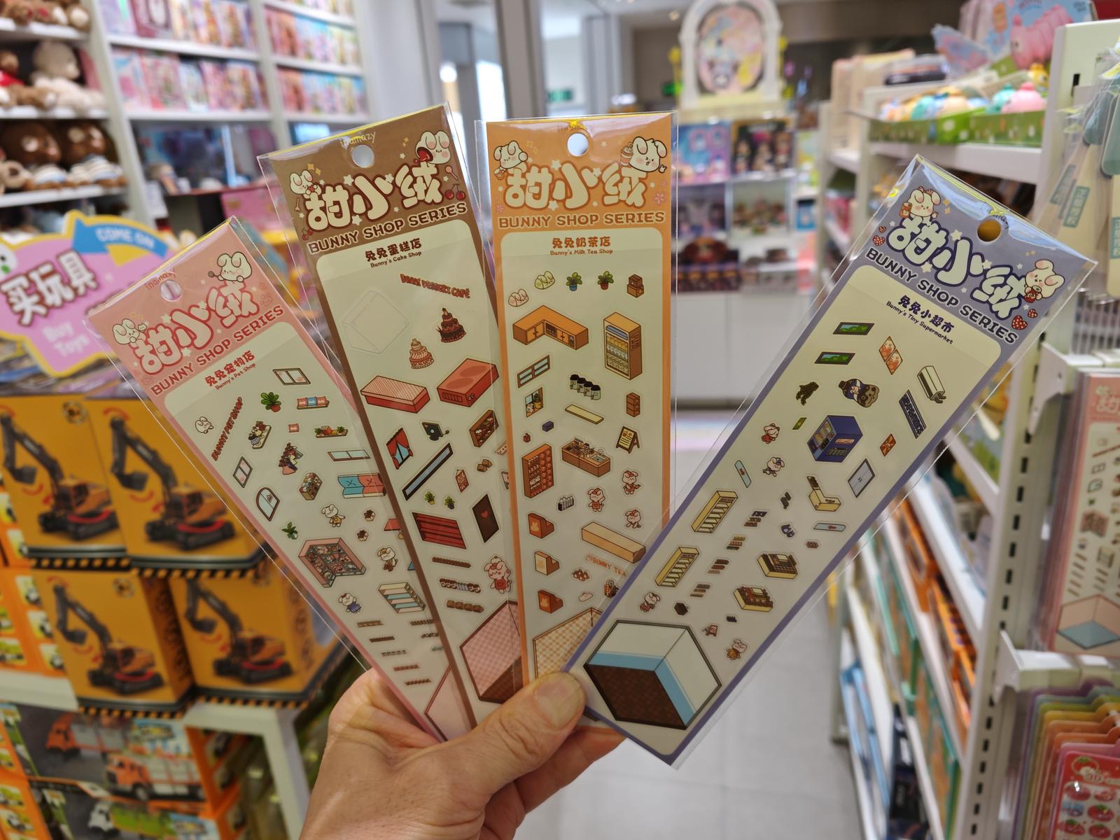 除了设计精巧的国风系列,货架上还有操作更为简易的款式。“甜小绒”系列迷你造景贴纸包含超市、奶茶店、蛋糕店、宠物店四种场景,贴纸数量较少,操作简单,售价为5元,适用年龄为6岁以上。此外,还有一款尺寸更大的造景贴纸同步在售。店员透露,目前各款贴纸的销量相差不大,受众覆盖各个年龄段。