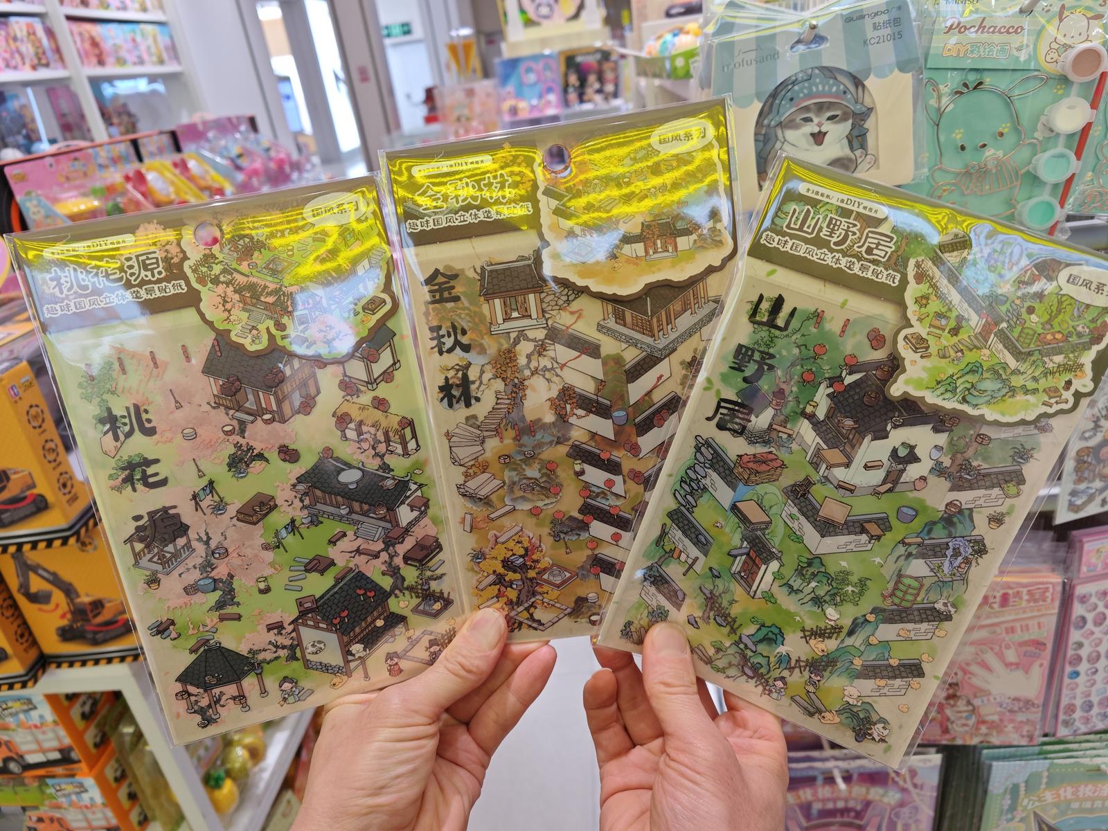 货架上,多种主题和场景的造景贴纸整齐陈列。其中,国风系列涵盖山野居、金秋林、桃花源、白雪歌等7款不同场景,每套包含3张PET贴纸及1张造景明信片,售价为5.9元。以“宋时雅事——点茶”为例,包装背面的效果图上,凉亭、假山、池水、茶社等元素栩栩如生、跃然纸上,尽显文人雅韵,将宋时闲情逸致的氛围感拉满。