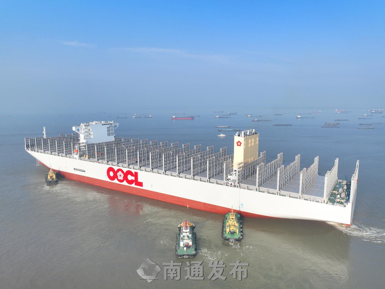江风猎猎,在南通中远海运川崎船舶工程有限公司的舾装码头上,刚完成试航的24000标箱甲醇双燃料集装箱船格外醒目。