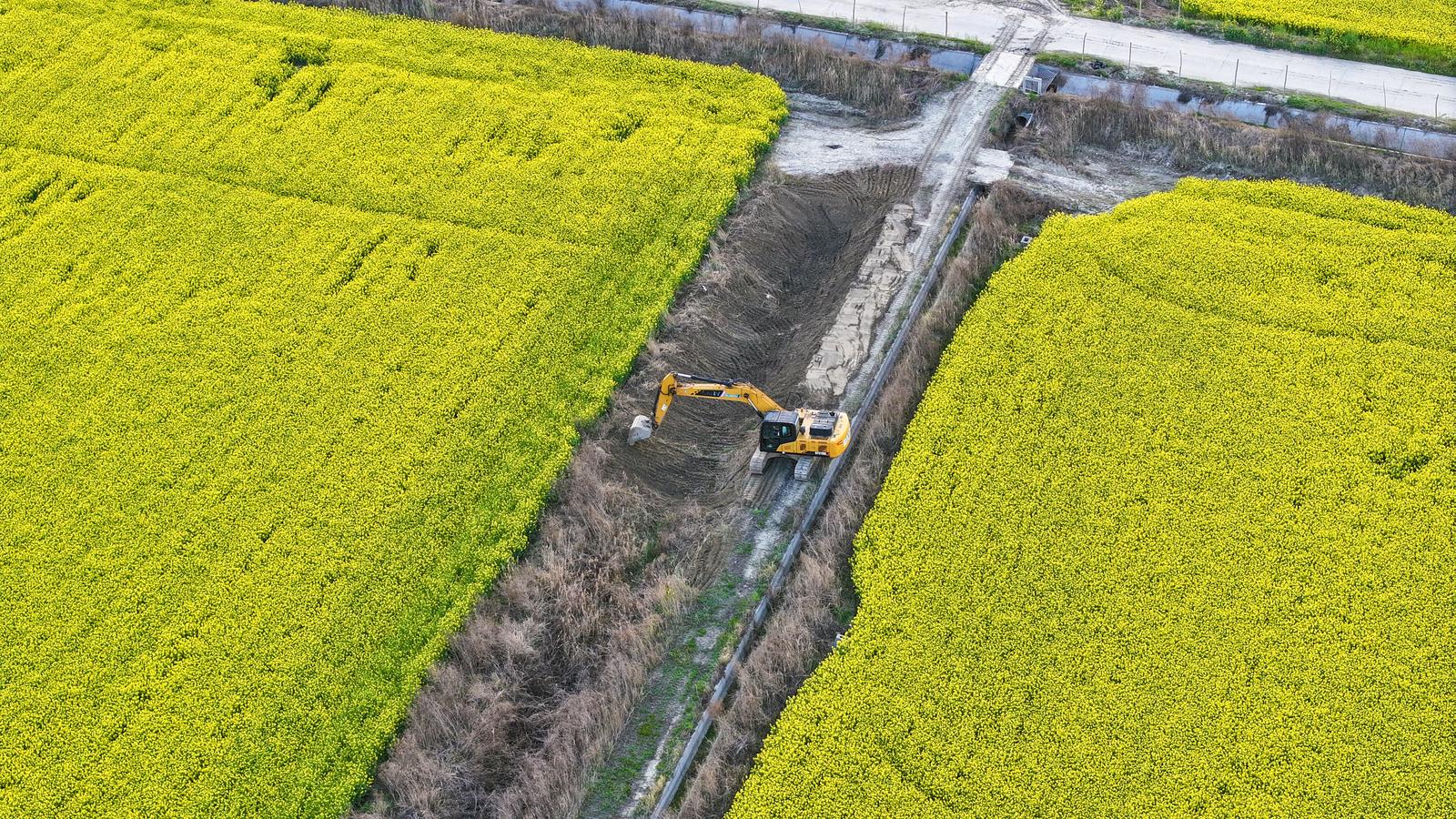 油菜花海中,“耕湿一体化”项目建设团队正在抓紧施工,挖掘机挥舞着长臂挖渠、筑桩,一片错落有致的湿地生态系统已初具雏形。