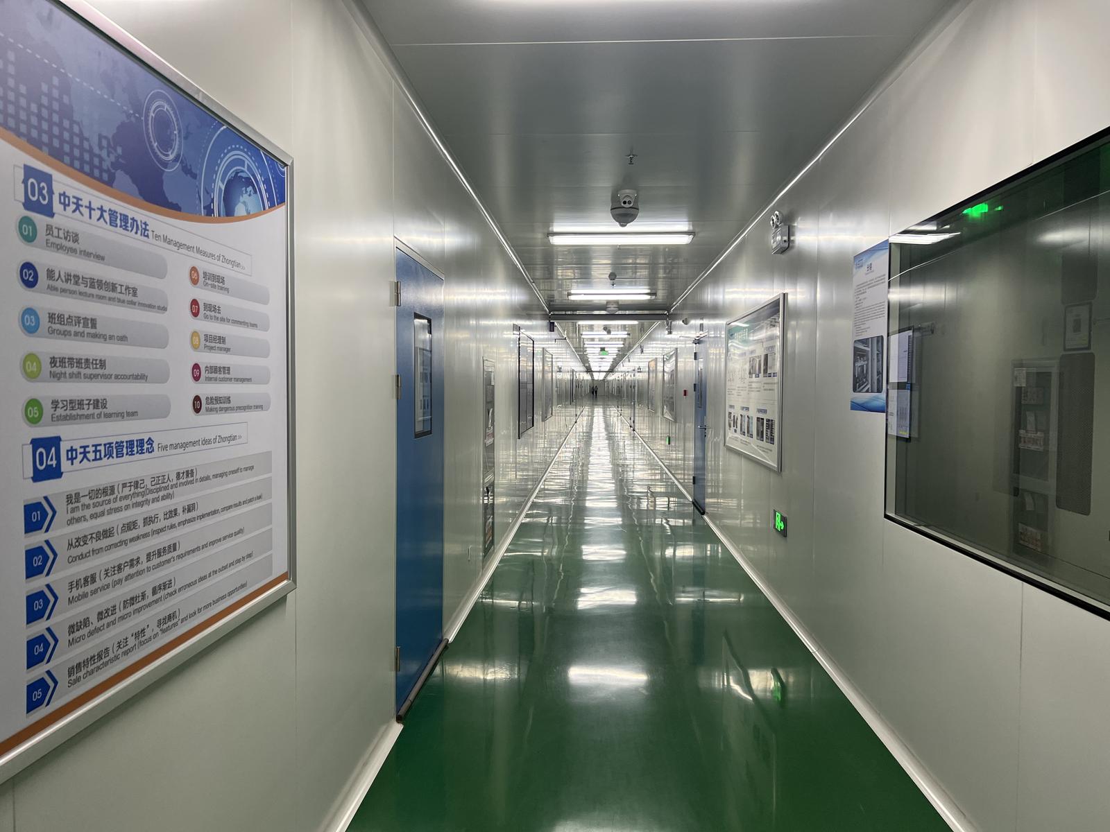 中天储能电芯生产车间走廊墙壁上张贴了集团十大节能技术以及具体案例。