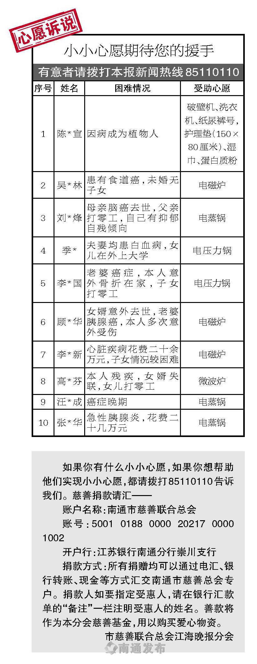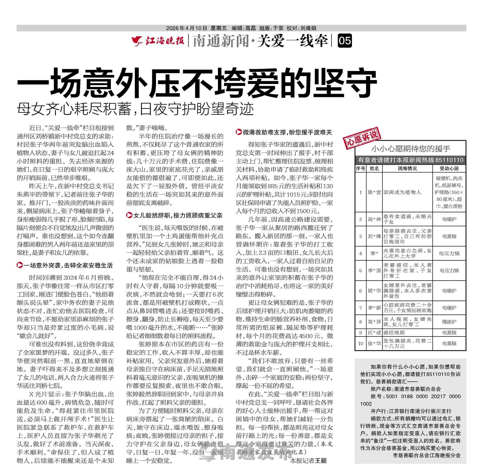 近日,“关爱一线牵”栏目组接到通州区刘桥镇新中村党总支的求助:村民张子华两年前突发脑出血陷入植物人状态,妻子与女儿被迫扛起24小时照料的重担。失去经济来源的她们,在日复一日的艰辛照顾与庞大的开销面前,已然举步维艰。