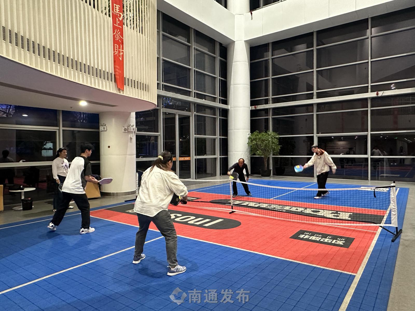 夜幕初垂,暖意渐浓。4月9日晚6时30分,南通创新区全民健身中心内涌动着青春朝气,一楼匹克球场地上,一群学员身着轻便运动服,在老师的指导下学习接球。阵阵清脆的击球声,也标志着南通创新区青年夜校再度开班,一场兼具知识、技能与乐趣的夜间“充电”之旅就此启幕。