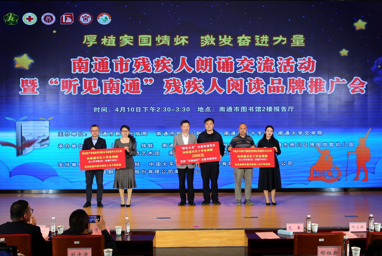 爱心捐赠环节,紫金财产保险股份有限公司南通中心支公司、中国太平洋财产保险股份有限公司南通中心支公司共同为市图书馆盲人电子阅览室捐赠10台盲人听书机;南通监狱“新生之光”公益改造项目为“文脉点灯”公益书房项目捐赠人民币2000元,为我市家庭困难的残障学生搭起温暖的阅读空间。活动现场,主办方还为志愿队伍“通大文学院无障碍朗诵团”授旗。