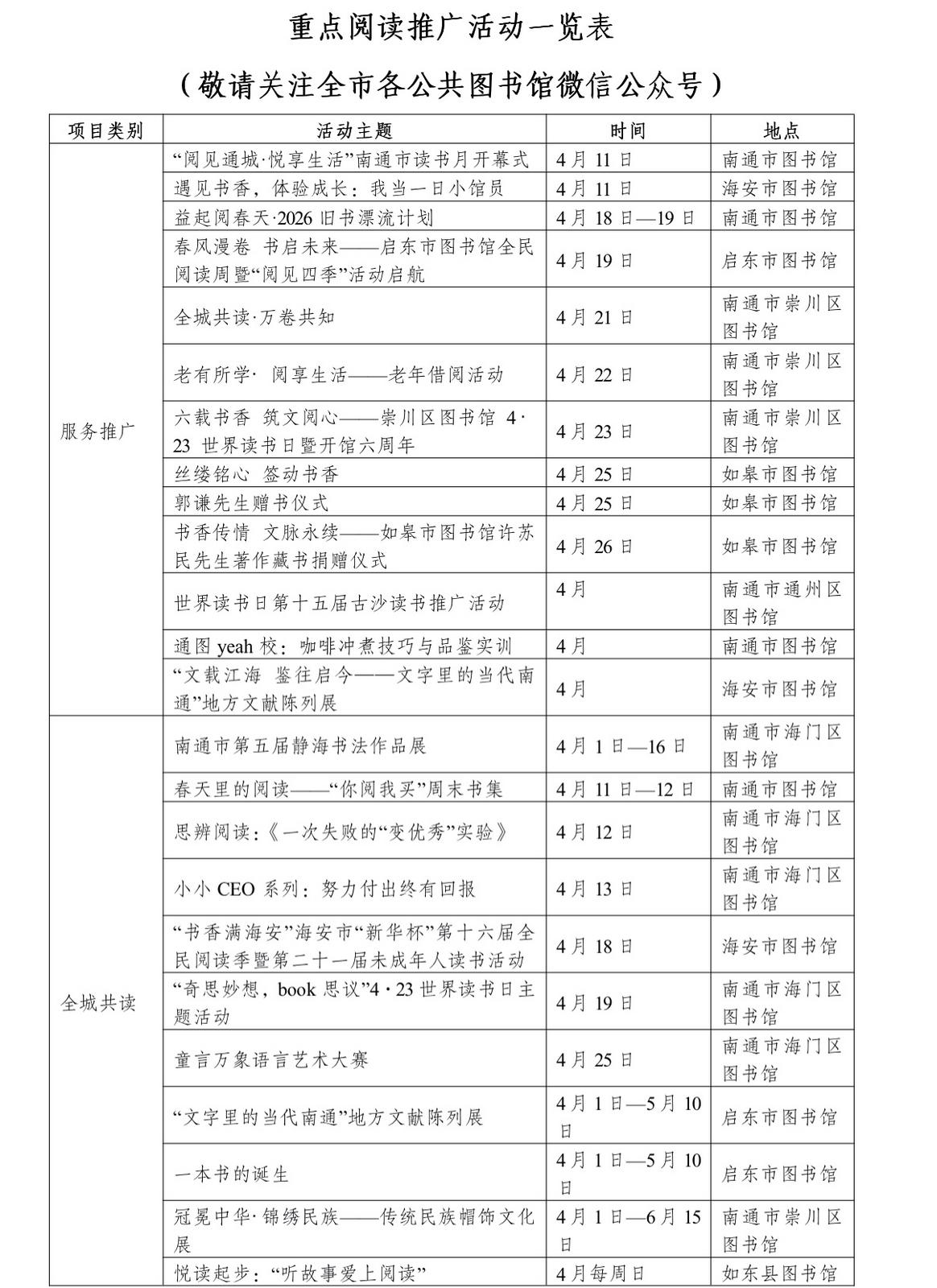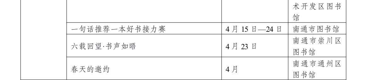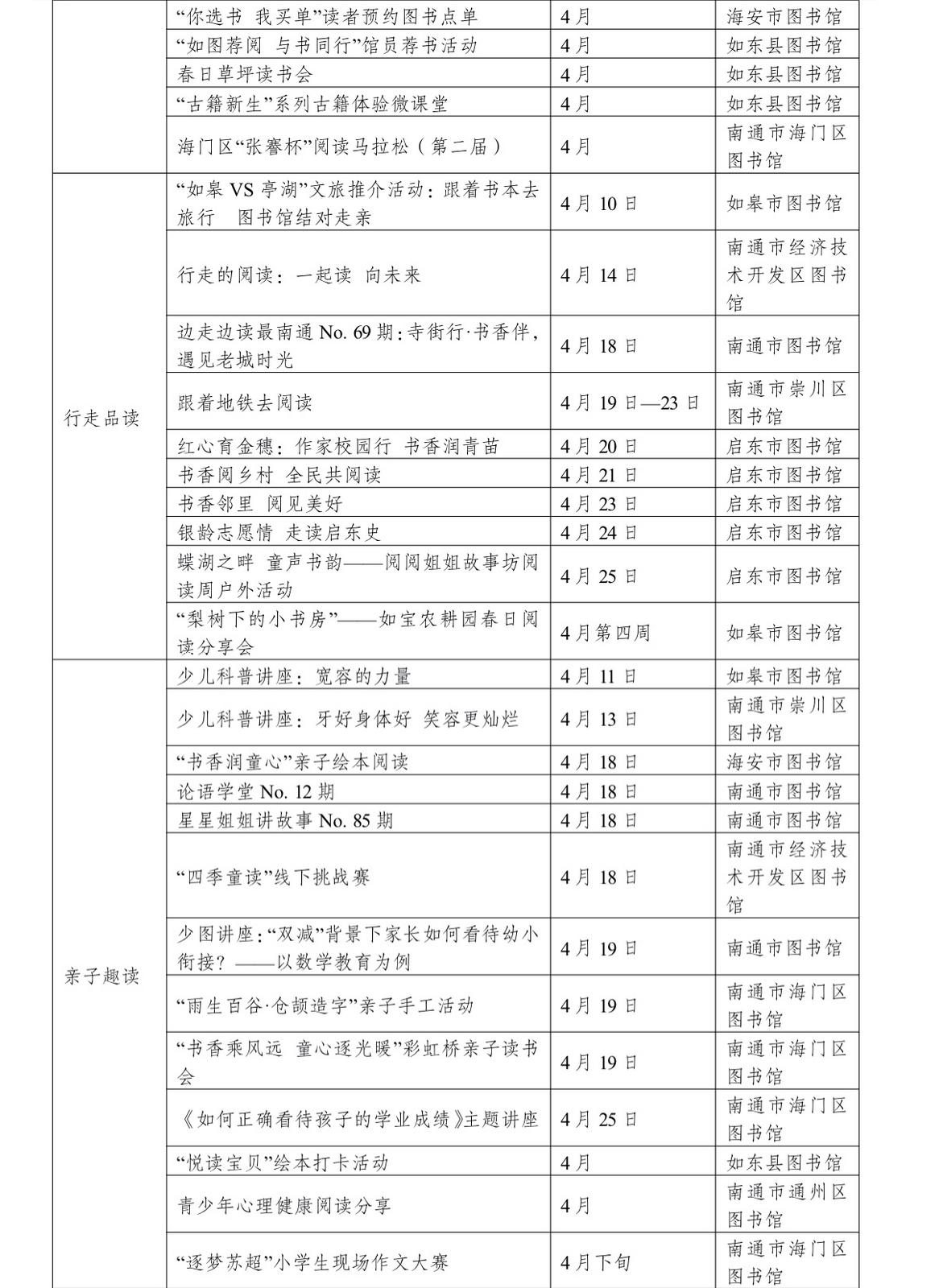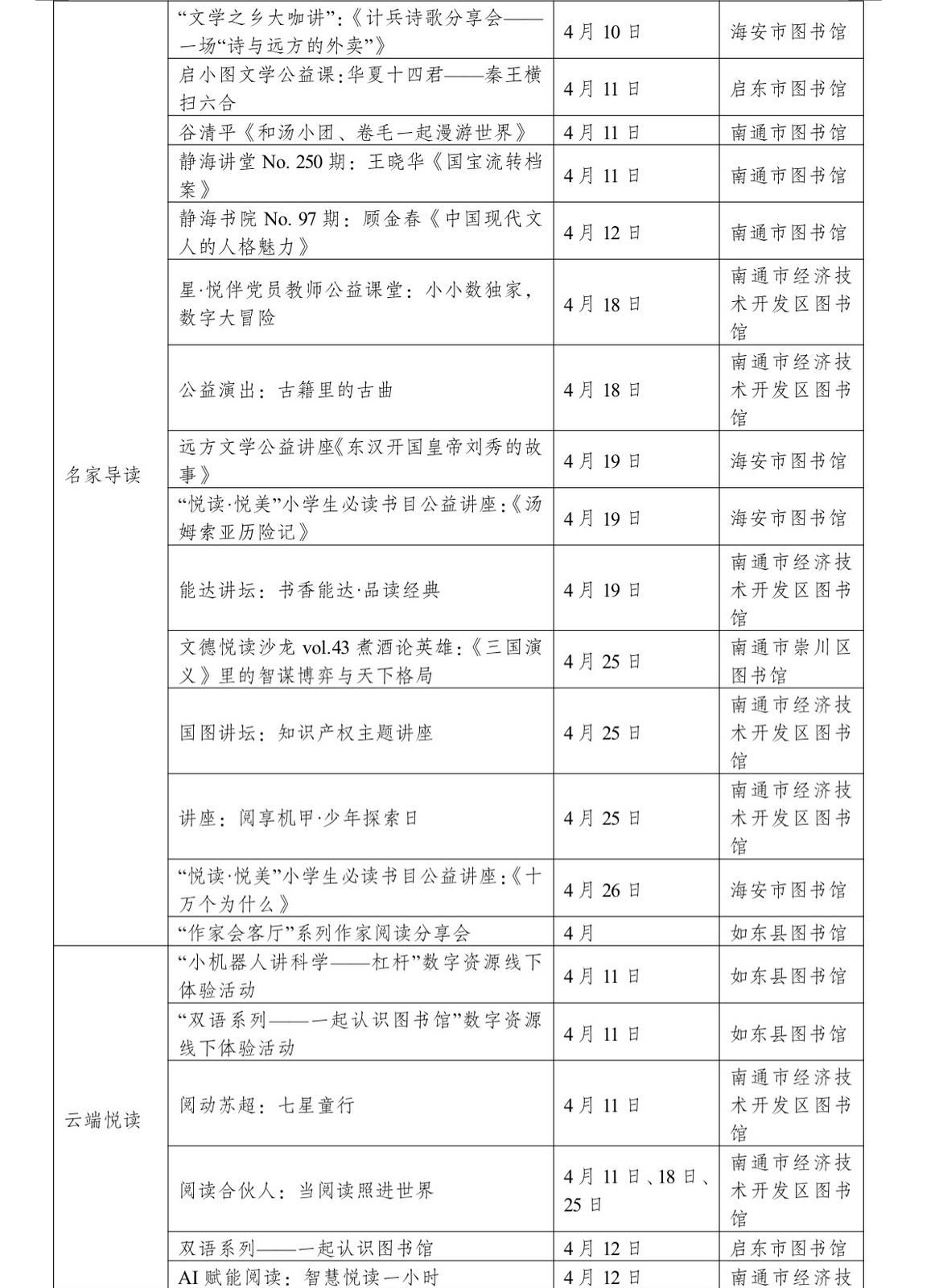 本次活动由中共南通市委宣传部、南通市新闻出版局、南通市文化广电和旅游局主办,依托全市公共图书馆资源,于4月集中推出涵盖服务推广、全城共读、云端悦读、名家导读、行走品读、亲子趣读等各类阅读推广活动160余场,覆盖老中青少不同群体,全方位满足市民多样化、高品质的精神文化需求。
