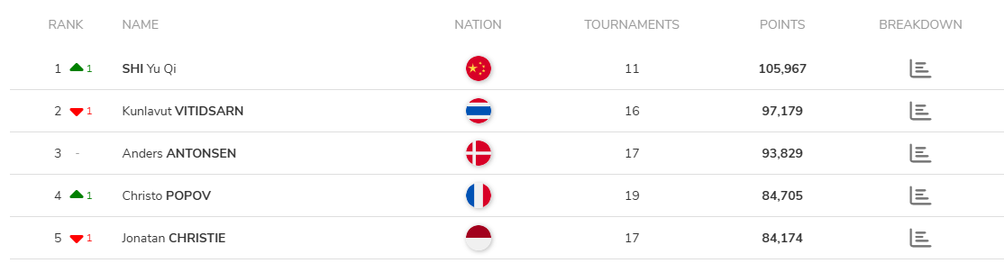 时隔5周,石宇奇重新坐上男单排名榜头把交椅。4月14日,羽毛球世界联合会公布了本周世界排名榜,石宇奇凭借上周在亚锦赛的上佳表现回到了领先位置,首次问鼎亚锦赛,让他填补了一项重要赛事的冠军空白,和名宿赵剑华、谌龙一样,他已经成为集七项重要赛事冠军于一身的羽坛风云人物。