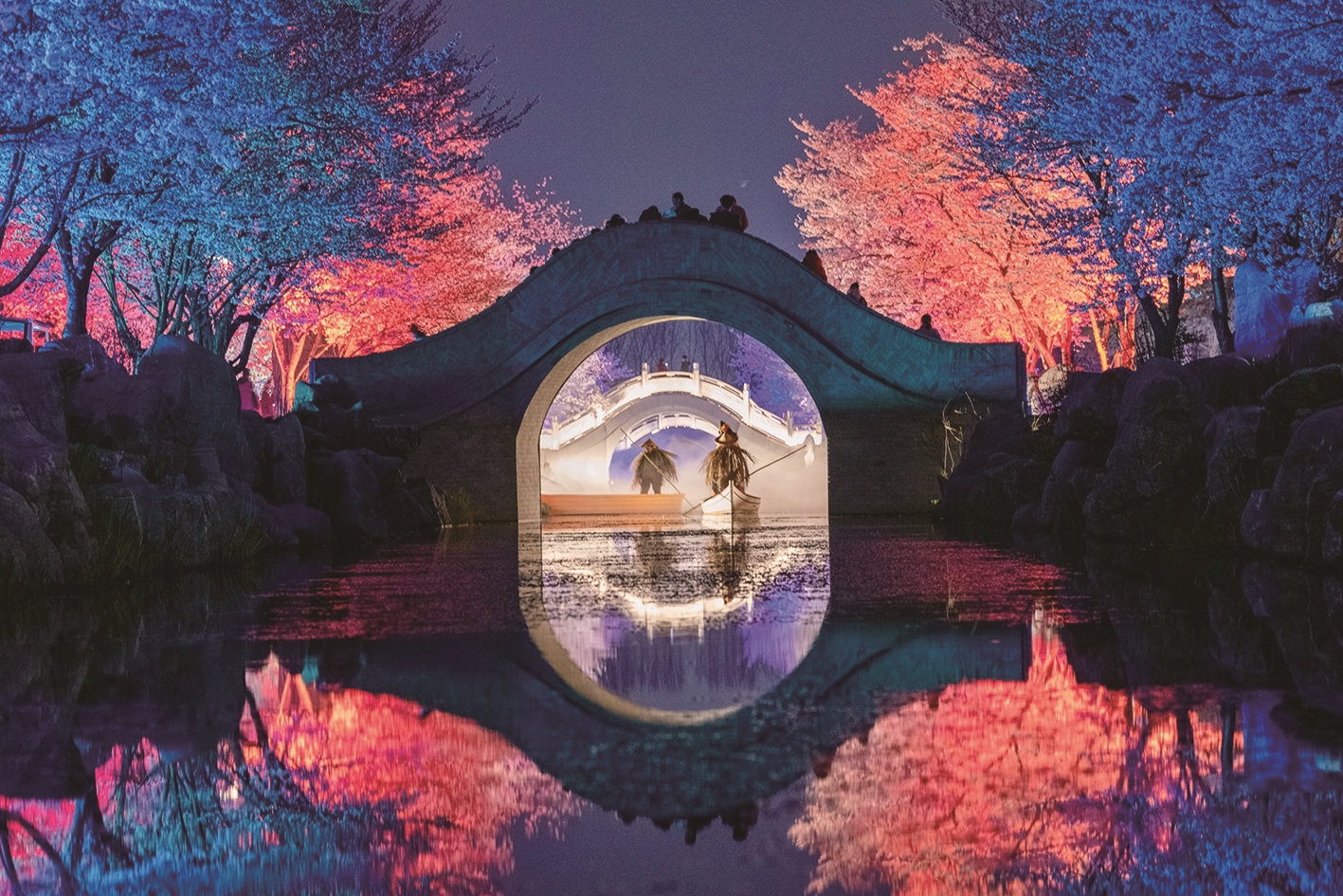 洲际梦幻岛的樱花谷更添几分野趣与诗意。五千余株樱花如云似霞,铺满火山地貌,与二月兰、芝樱花毯相映成趣,粉紫交织,美不胜收。待到夜色降临,华灯初上,国风人物泛舟河上、轻舞翩翩,又是另一番意境。风过花落,花瓣坠入河道,随流水缓缓流淌,将温柔揉进潺潺春水。雾森升腾之时,轻烟缭绕,花影朦胧,宛若人间仙境。不只梦幻岛,通城处处樱色——鲜花小镇、紫琅花谷的樱林亦繁花满枝,各美其美。漫步其间,静看花瓣翩然坠落,才懂樱花之美从不是张扬的热烈,而是从容落幕的淡然——就像南通人的性子,内敛却不失热忱。