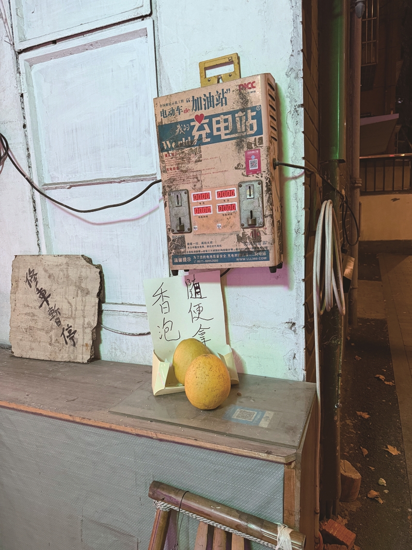 路过一条背街小巷,巷子边有间修车铺,大概就三平方米,简陋得不能再简陋了。靠墙边放了张三合板拼接起来的高台子,台面上放了两只香泡,还有张硬纸片,上面写着五个字:香泡,随便拿。