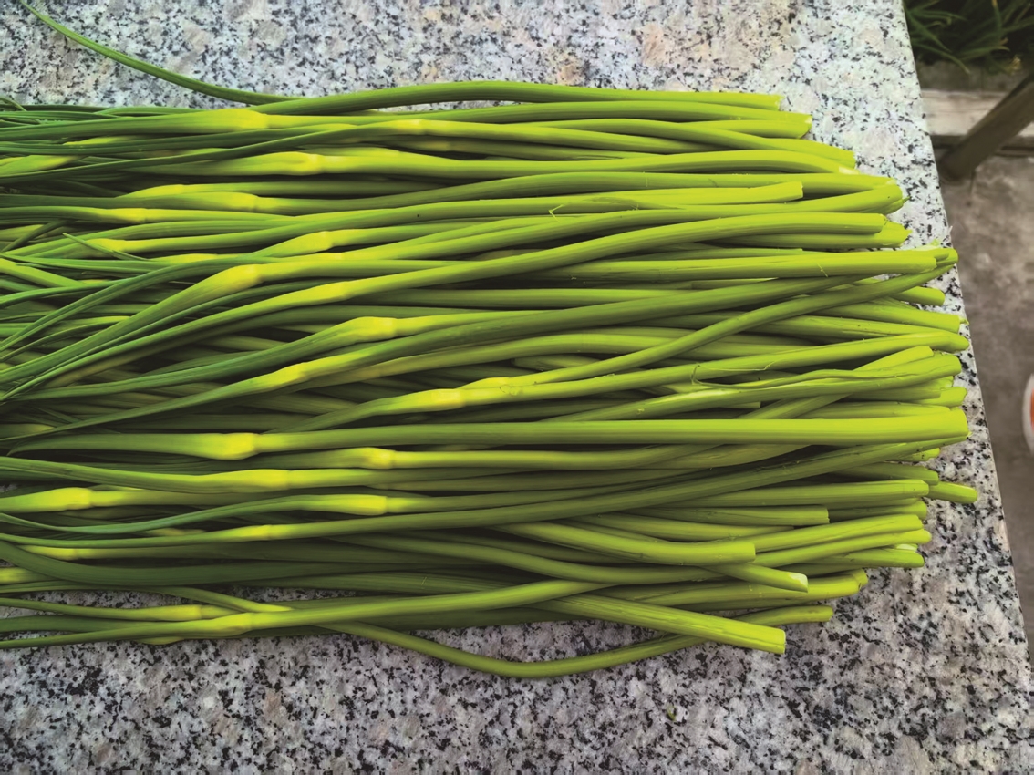 被这份鲜活劲儿感染,我也下田学着剥蒜薹,可即便小心翼翼,蒜薹的茎干还是被我接连折断,沮丧的我一时不知从何下手。“要有耐心,先用大拇指指甲从蒜株中上部划破,再慢慢撕开几层蒜皮,才能抽出完整的蒜薹。”妻子边说边示范。我照着要领尝试,动作渐渐熟练,抽出的蒜薹也愈发完整修长。不过半个时辰,我们就收获了一大把鲜嫩的蒜薹。我提议送两把给朋友尝鲜,再留一把做蒜薹炒肉丝。妻子欣然应允。