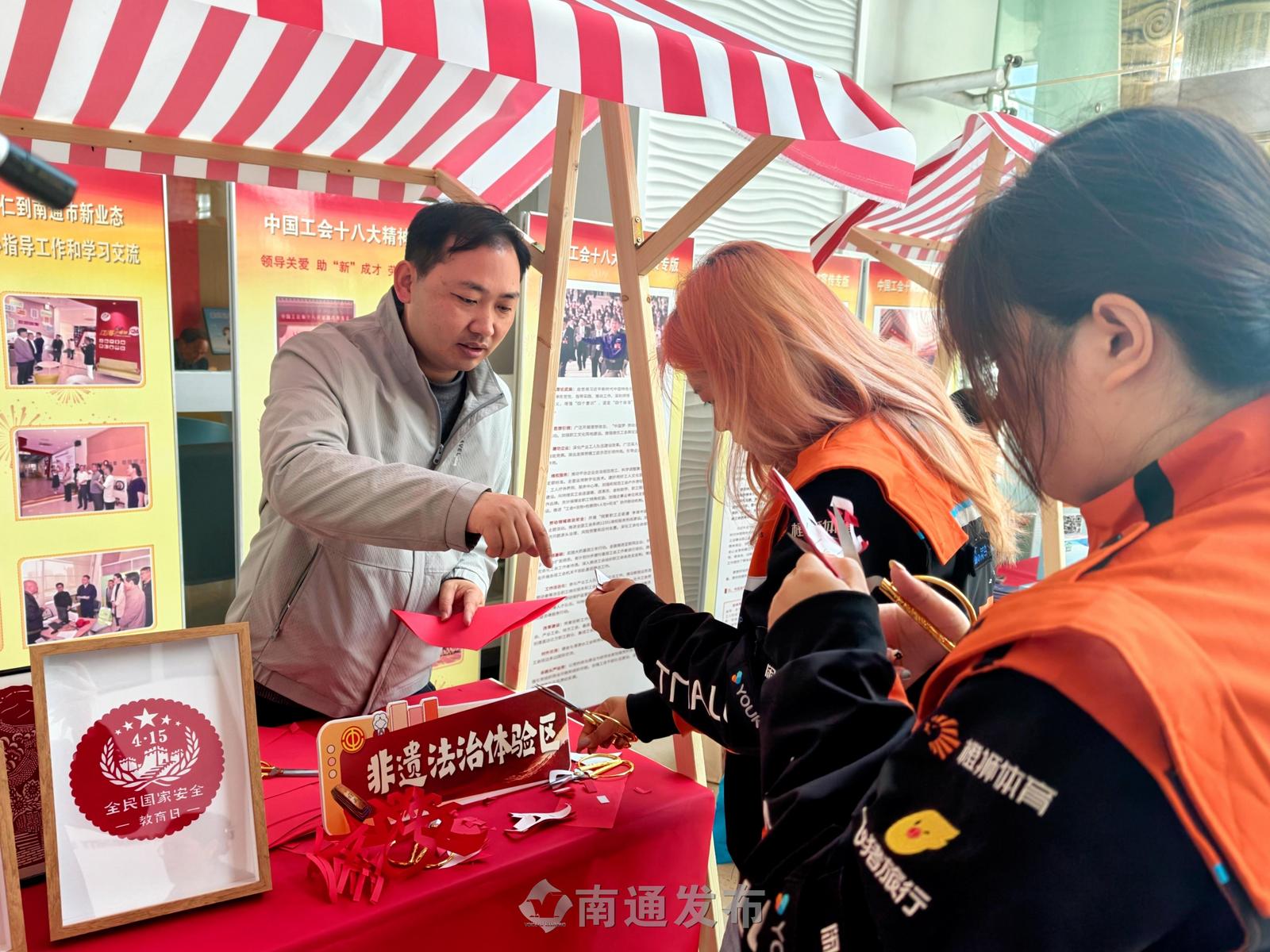 场外的互动体验区将学习氛围持续延伸。劳动者们在“国家安全知识问答大挑战”中巩固知识,在“国家安全非遗剪纸”体验中感受传统技艺与主题教育的融合,并在“倡议书签名墙”上郑重署名,许下维护国家安全的庄严承诺。现场同步开设的扫码入会、困难帮扶、法律咨询等一站式服务摊位,将工会的关怀转化为可触可感的实际支持,实现了从场内教育到场外服务的无缝衔接。一位参与活动的外卖小哥分享感受时说:“以前觉得国家安全离我们很远,今天听了讲座、参加了互动才发现,配送途中注意保护客户信息、不拍不传敏感场所照片,这些小事都是在为国家安全出力。”