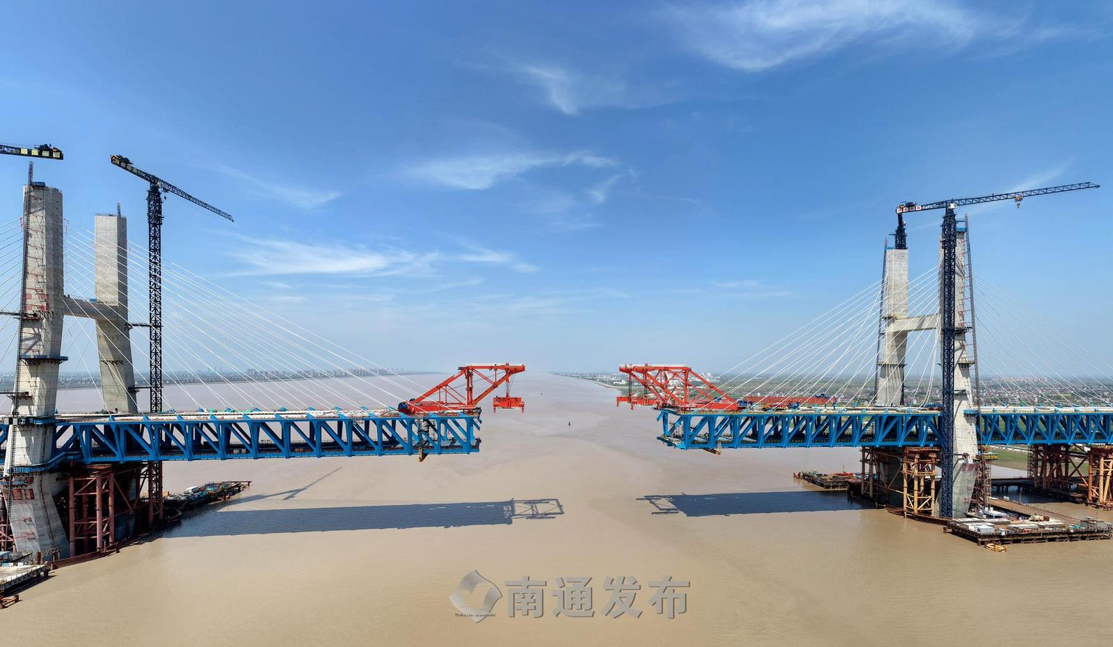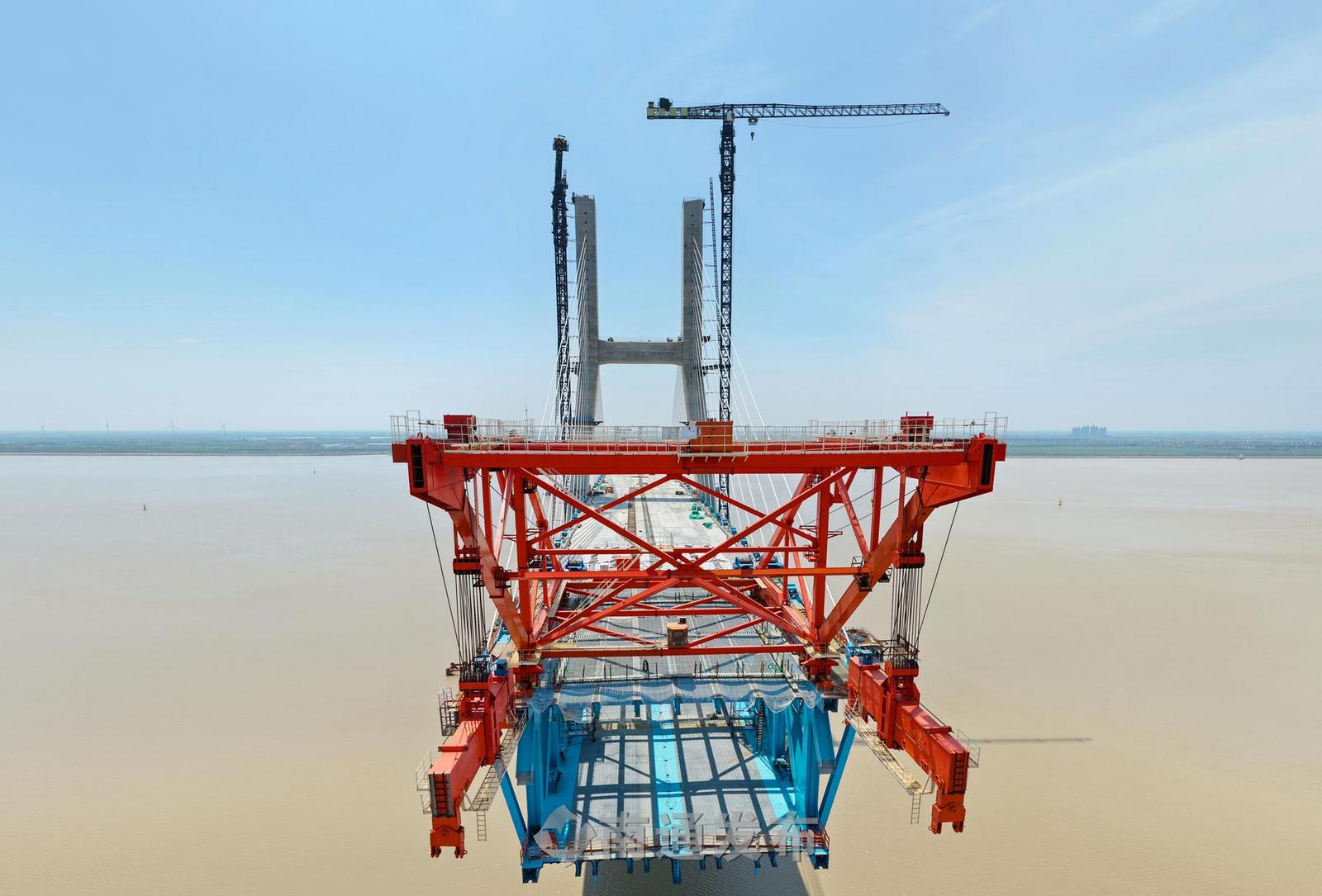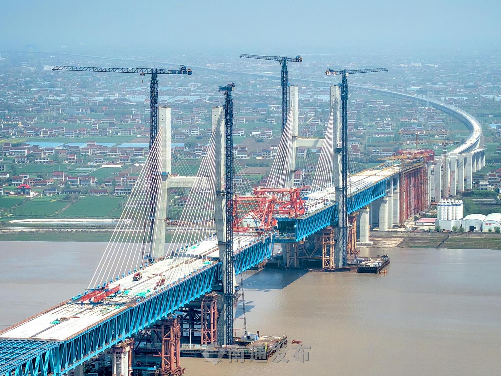 2026年4月15日,在万里长江入海口拍摄的由长江沿岸铁路集团公司建设、上海国铁工程建设管理有限公司建设管理、中铁大桥局施工的目前在建的世界最大跨度公铁两用无砟轨道斜拉桥——崇启公铁长江大桥施工现场。眼下,中铁大桥局1000余名建设者奋战在崇启公铁长江大桥钢梁架设、斜拉索挂设、公路桥面板钢筋焊接等关键点位施工现场,全力冲刺5月底主通航孔桥钢桁梁合龙目标,实现上海崇明和江苏启东相连。目前 崇启公铁长江大桥工程总进度已完成88%。