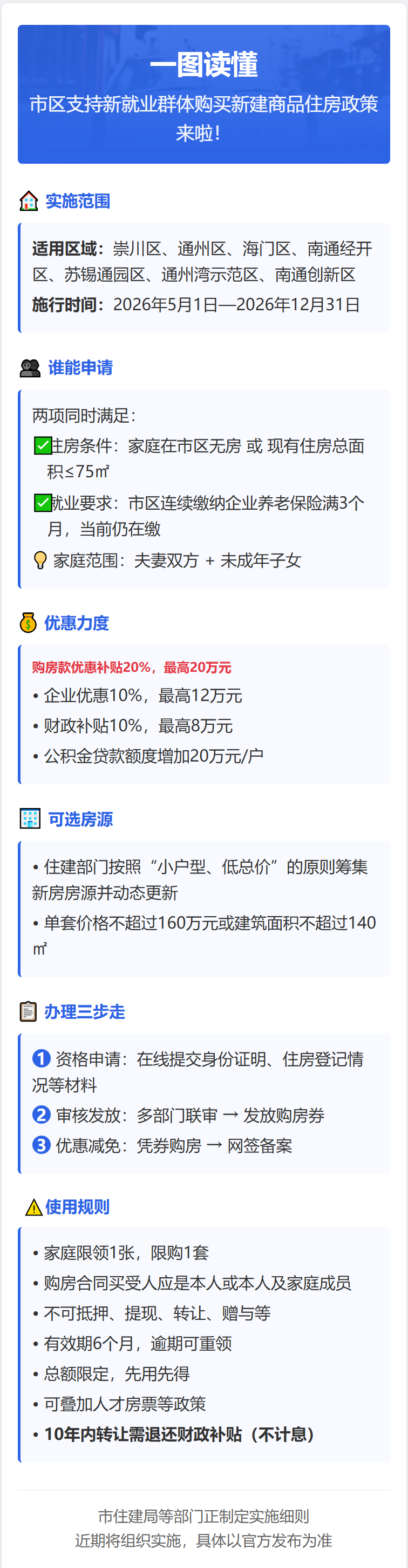此次新政实施范围覆盖崇川区、通州区、海门区、南通经济技术开发区、苏锡通科技产业园区、通州湾示范区、南通创新区等南通市区全域,政策自2026年5月1日起正式施行,有效期至2026年12月31日。