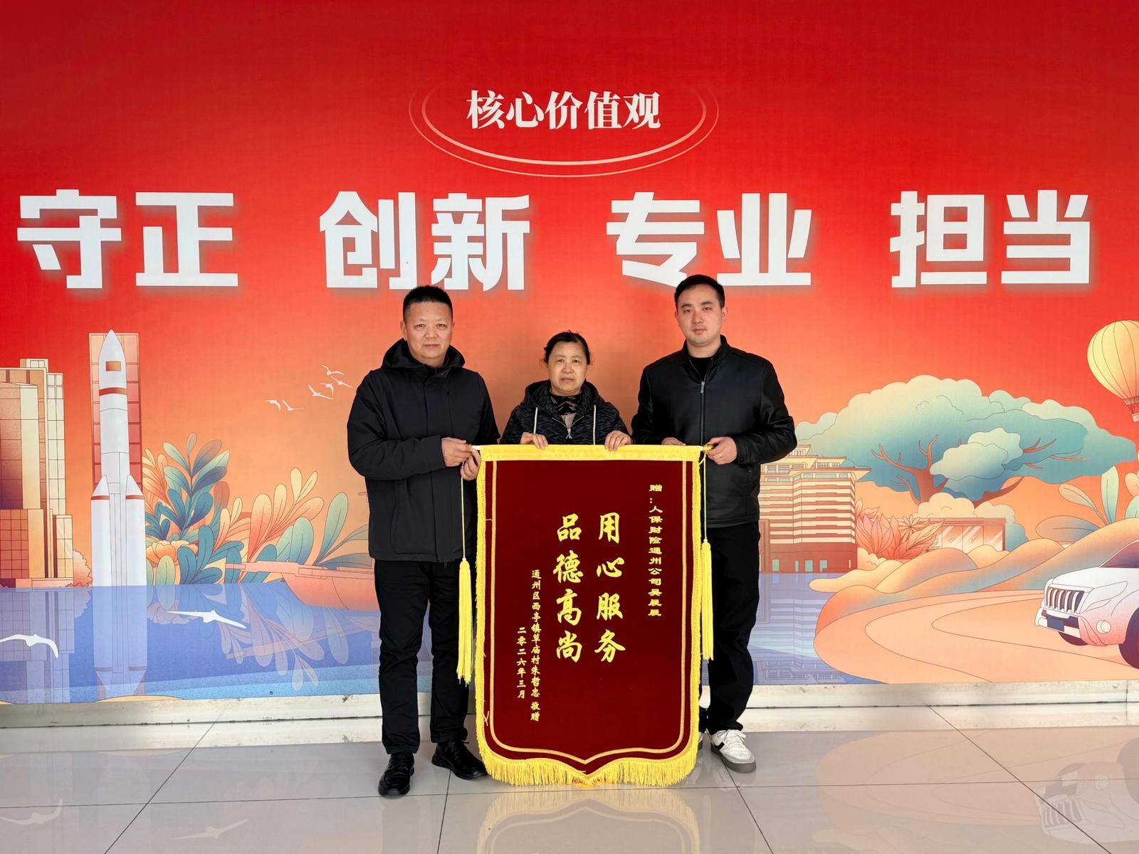 近日,人保财险通州支公司收到一面印有“用心服务 品德高尚”的鲜红锦旗。锦旗由通州区西亭镇一位交通事故伤者家属专程送来,对公司理赔团队贴心周到、尽职尽责的暖心服务表示感谢。