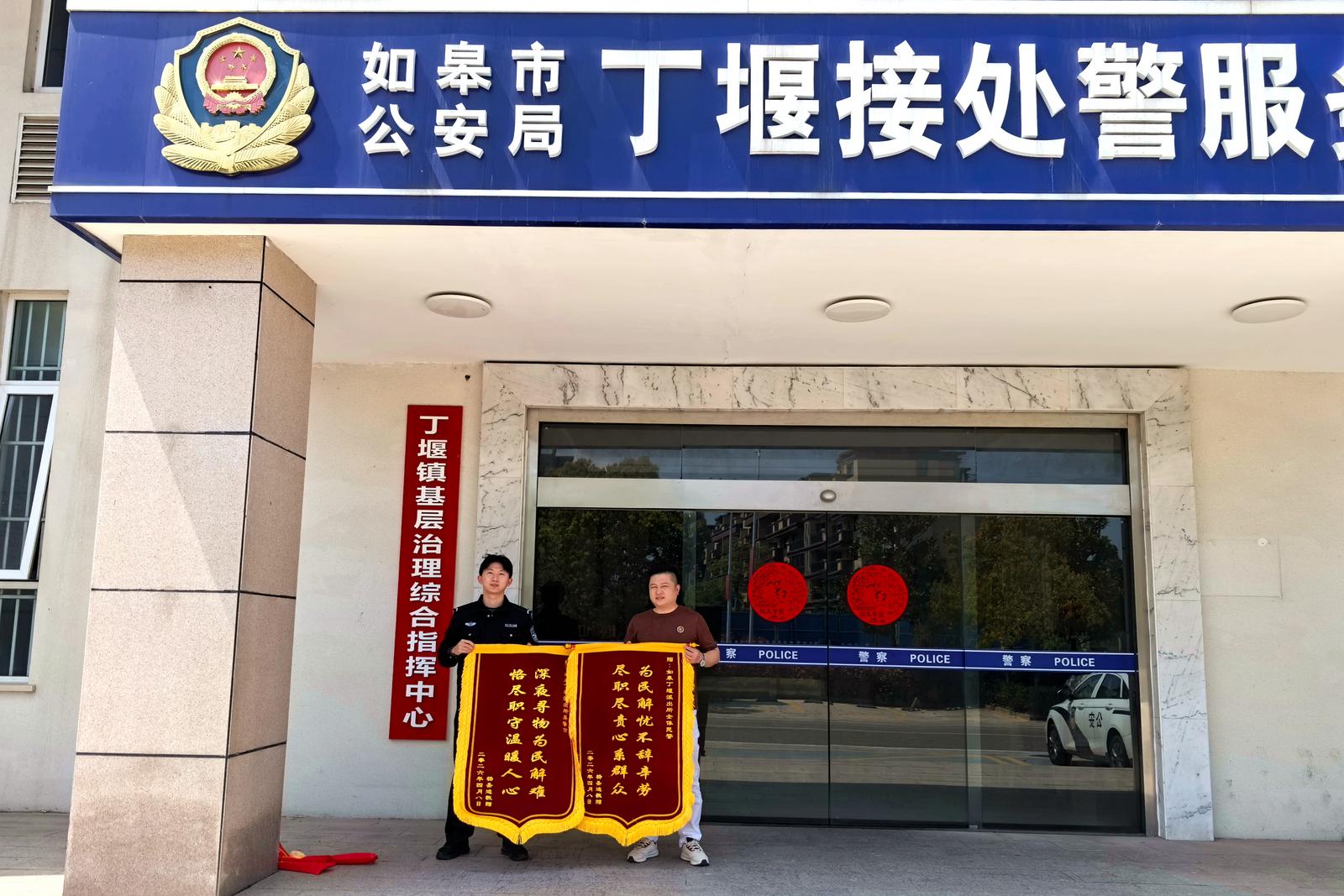 “太感谢了,深夜帮我找回了手机……”15日上午,如皋市公安局丁堰派出所内,杨先生将一面印有“深夜寻物为民解难,恪尽职守温暖人心”的锦旗郑重递到“00后”新警吴祺手中。与此同时,他还将另一面写有“为民解忧不辞辛劳,尽职尽责心系群众”的锦旗赠予丁堰派出所,对派出所高效为民排忧解难深表感谢。