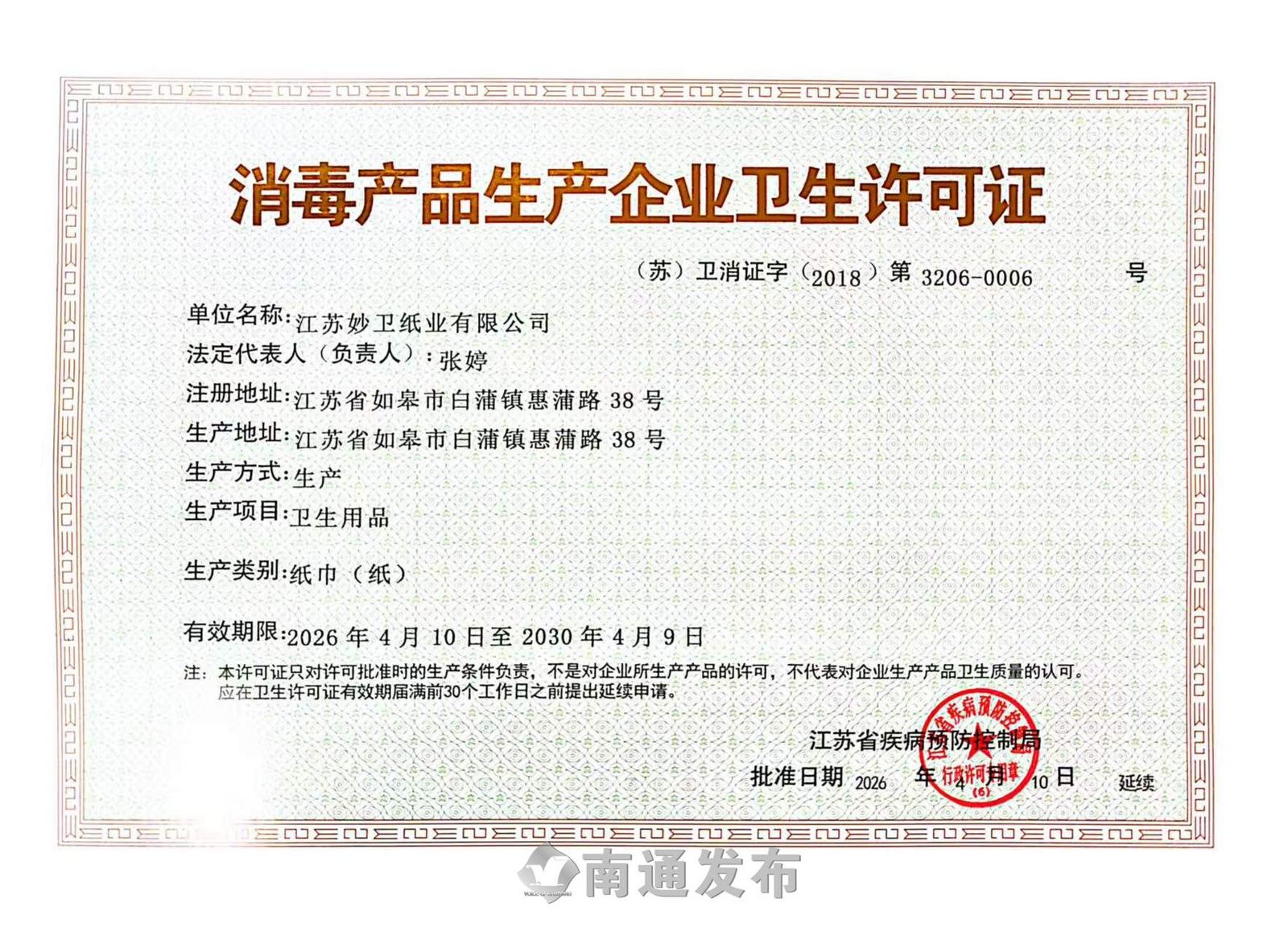 陆永东介绍,外人不知的是,企业所生产的纸巾类产品涉及公共卫生安全,因此,必须获得卫生监督部门审核颁发的《消毒产品生产企业卫生许可证》,该证4年接受一次审验并换发。