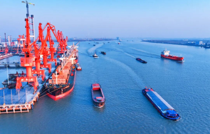 铁矿石、纸浆等进口原材料完成“大船换小船”后,由长江主航道、京杭大运河、连申线运往全国各地;炼油模块、风电设备等在港口完成组装后快速出海,销往全球——这是如皋港的日常。