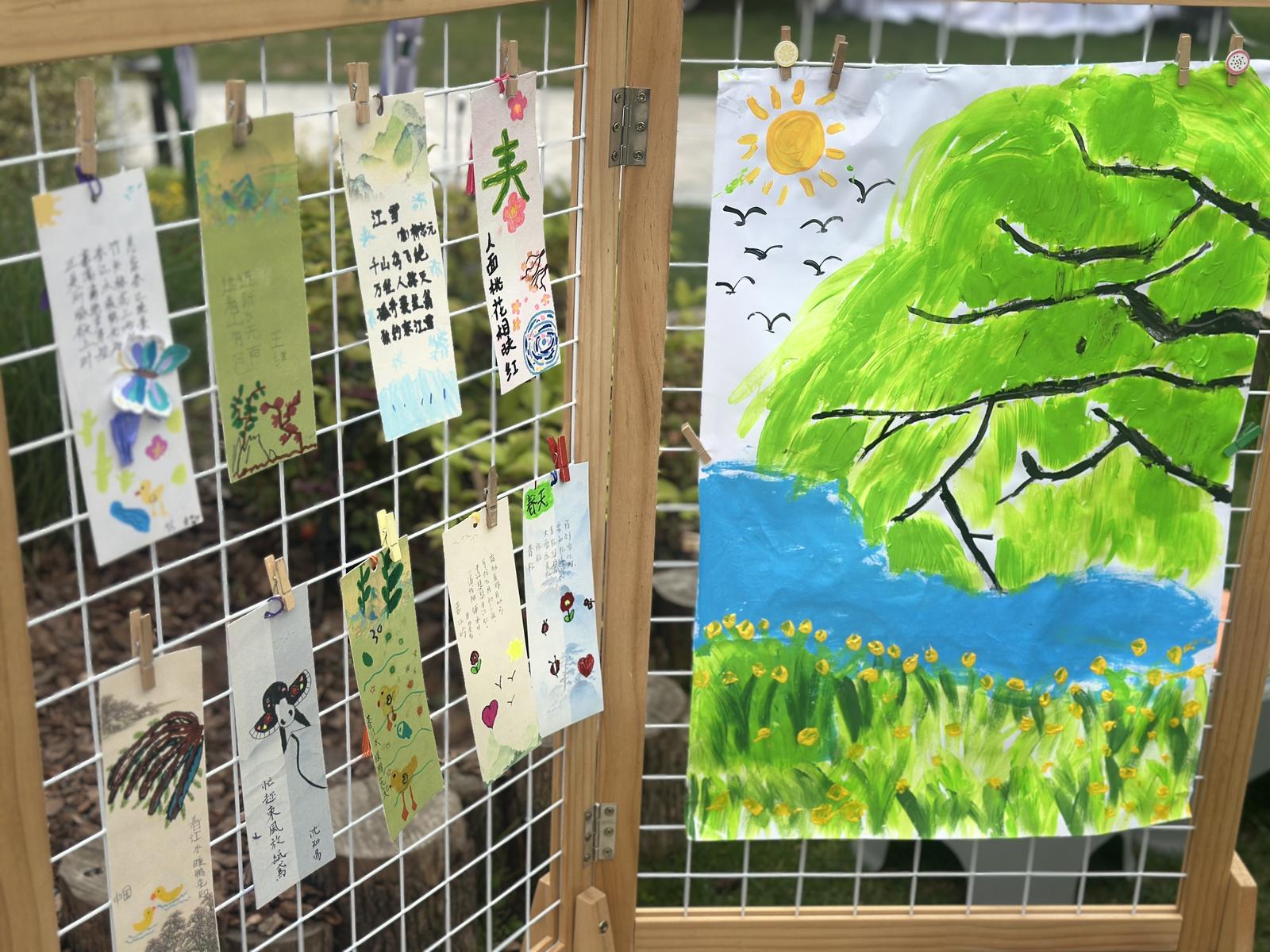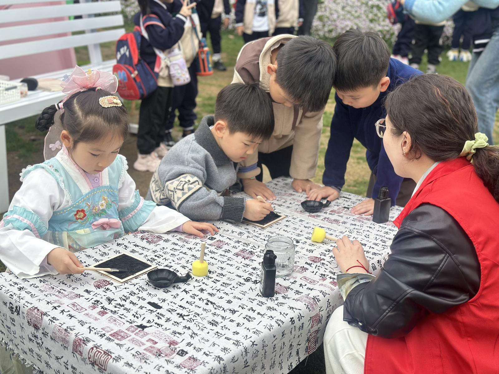 再看草坪上,大三班“字藏千年·小手活字印”活动如火如荼。老师一边指导孩子们操作字板、刷子和墨汁,一边揭开活字印刷的奥秘。在社区志愿者协助下,孩子们亲手“印刷”出一席诗词,脸上写满惊喜。咖啡馆门口,大四班正同步举办“一叶书香·巧手制书签”活动。孩子们四人一组围坐一桌,用彩色画笔描绘出自然景观、阅读故事或是天马行空的想象,并热情地跟老师和志愿者讲述色彩搭配的巧思。