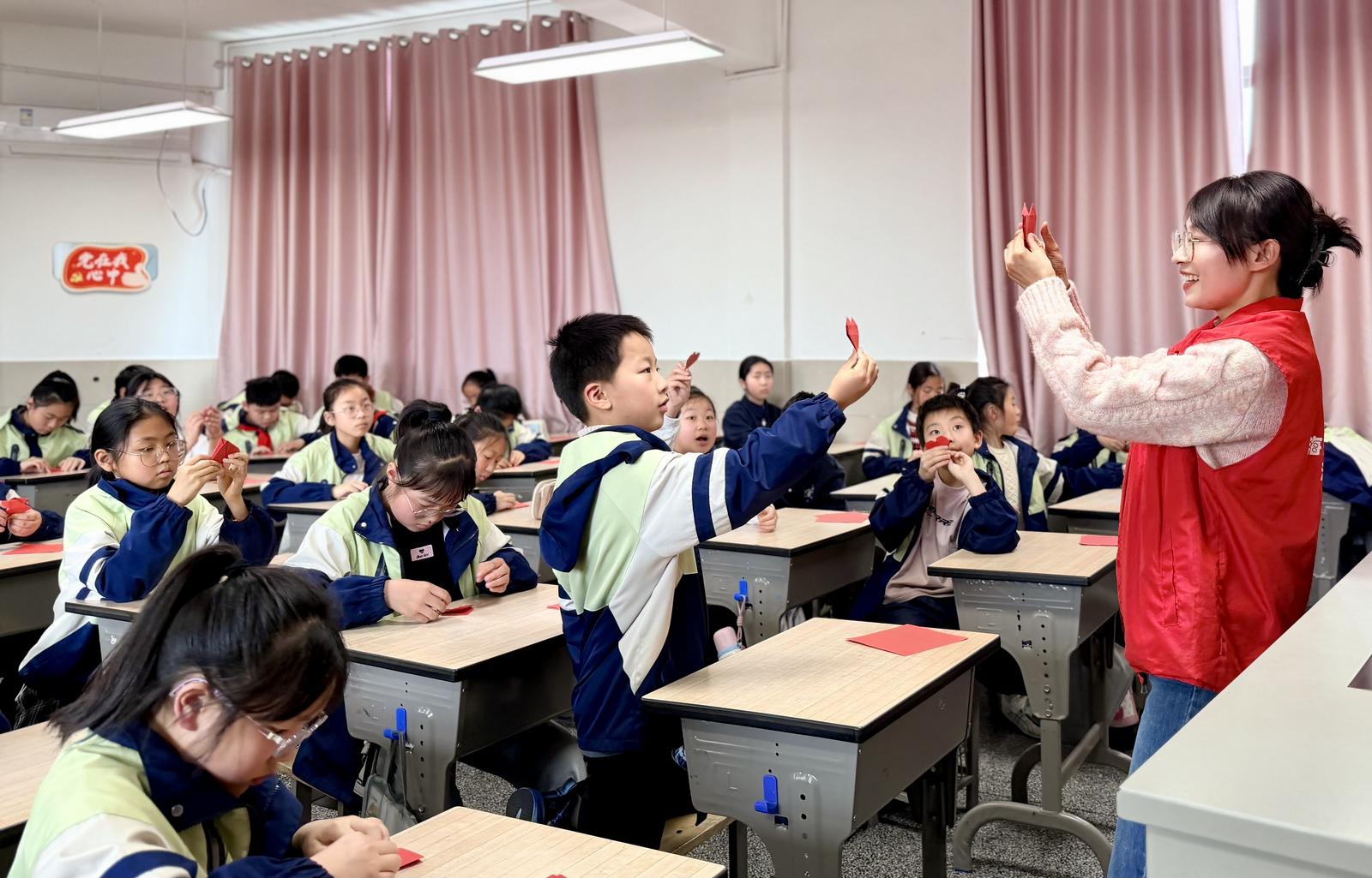 张思德无私奉献的故事深深打动了孩子们。随后,在志愿者的带领下,大家开始了“折爱心”环节。红色的彩纸在稚嫩的指尖翻转、折叠,不一会儿,一颗颗饱含深情的“爱心”便跃然桌上。“张思德爷爷,您是我们学习的榜样!”“我也要做一个全心全意为人民服务的人!”……一折一划,都融入了孩子们对英雄最纯真的敬意。