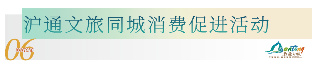 围绕长三角一体化发展,深化沪通文旅协同发展,组织“上海下一站”“乘着高铁游南通”等系列文旅交流推广活动,出台年度游客招徕政策、福利优惠,推出涵盖长三角多品类消费场景的“Visit Nantong Pass旅游联卡”2.0版,让沪通文旅同城消费更活跃、更便捷。