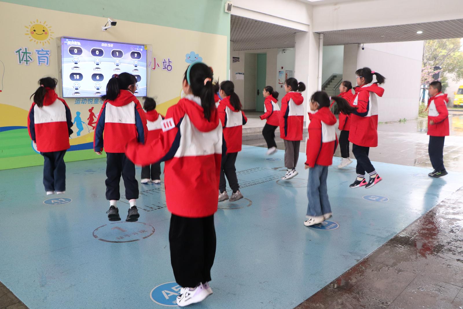 这个备受孩子们追捧的体育小站,是学校打造的“AI运动角”。跳绳、跳远、切水果、跳房子等项目全天候开放,刷脸即玩、自动计数。学校体育学科负责人赵娟介绍,项目分跳类、投掷类、素质类三种,包含多人跳、开合跳、单手投篮、双手投篮等多个小项。“孩子自己选,课间也能玩两把。”