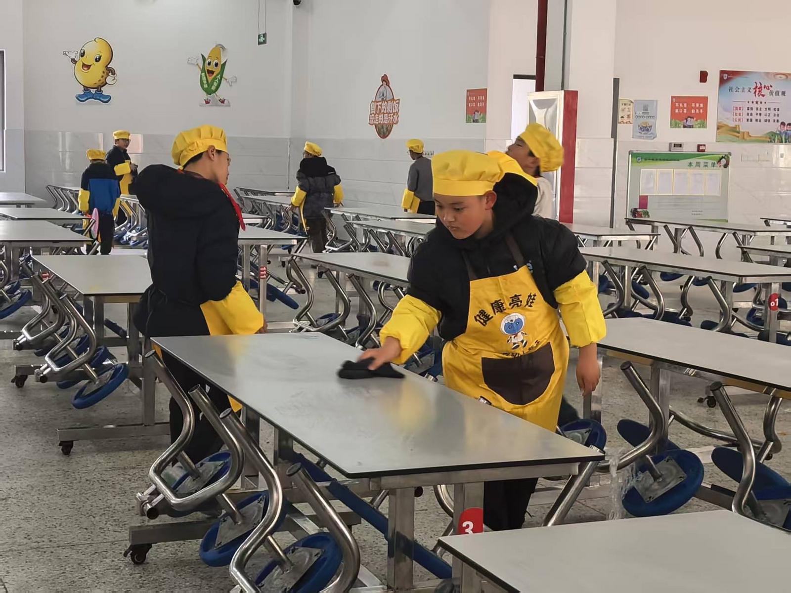 负责洗碗的朱潇然手上沾着泡沫:“先用洗洁精搓掉油垢,过好清水,再码整齐送到回收处。”负责扫地的江怡萱接过了话:“我们分区域打扫,一人一排,效率比昨天高!”食堂工作人员郁伟红在一旁笑道:“孩子们很认真,动作也很麻利。他们洗完后我们还要再清洗消毒,但这个过程很有意义。”