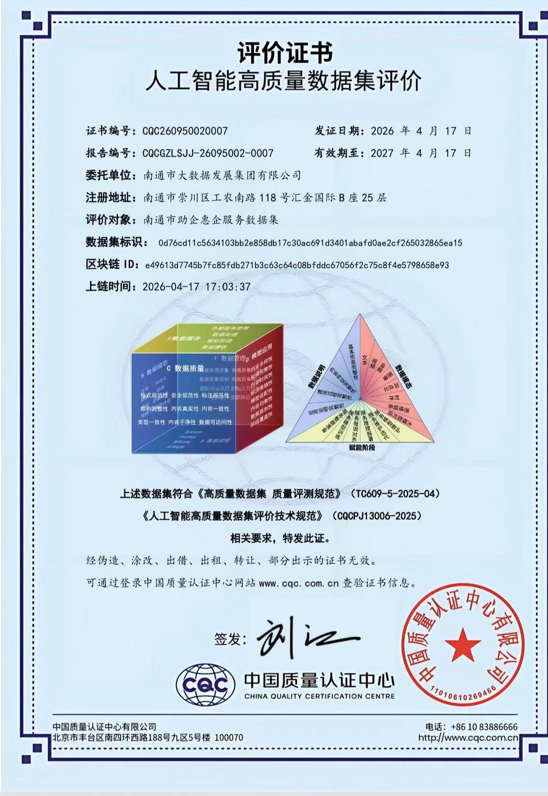4月17日,南通市大数据发展集团有限公司关于惠企助企方面的高质量数据集成功取得中国质量认证中心在南通首张《人工智能高质量数据集评价证书》。首张证书的获批标志着集团高质量数据集建设工作取得突破,为人工智能产业提供关键基础资源支撑的能力得到进一步提升。