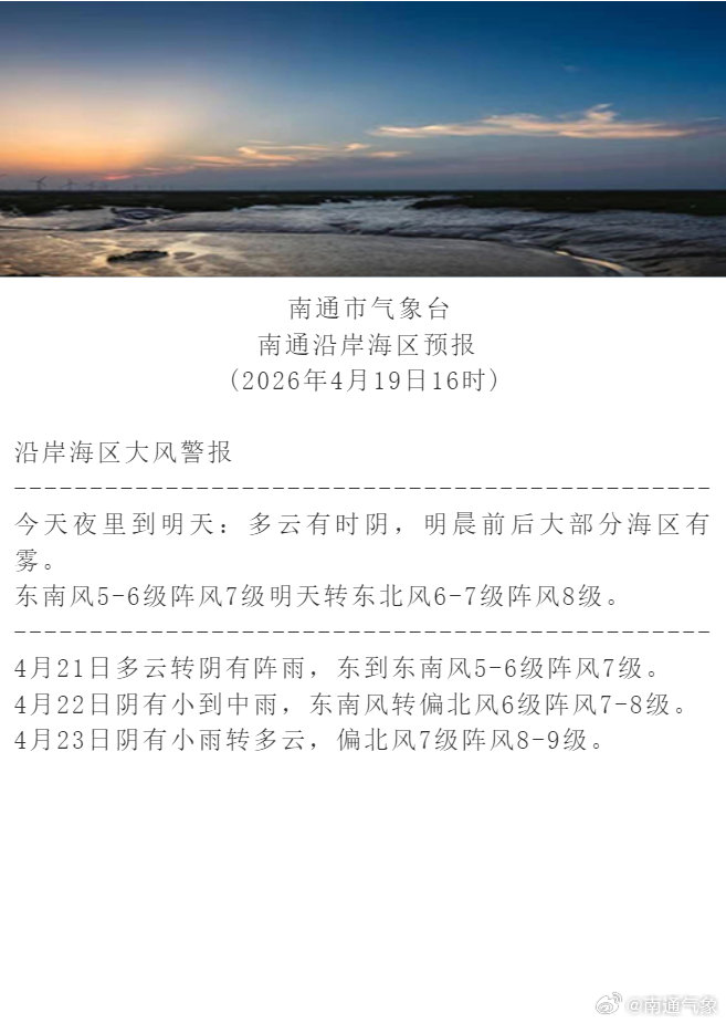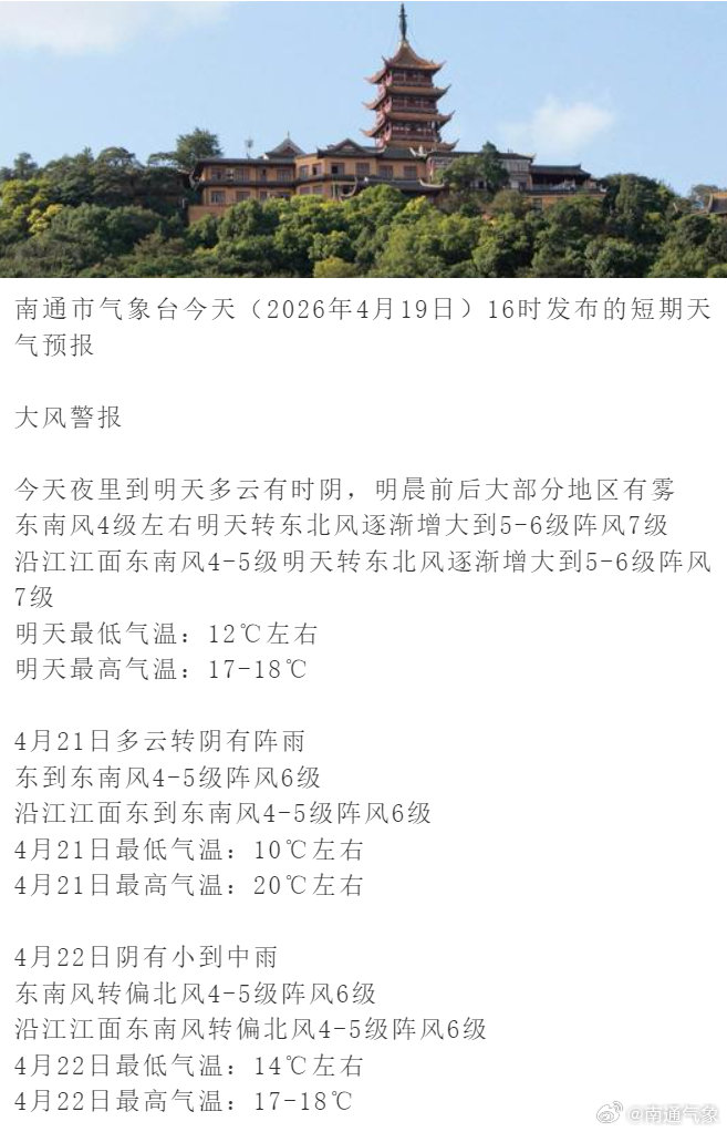 南通市气象台今天(2026年4月19日)16时发布的短期天气预报