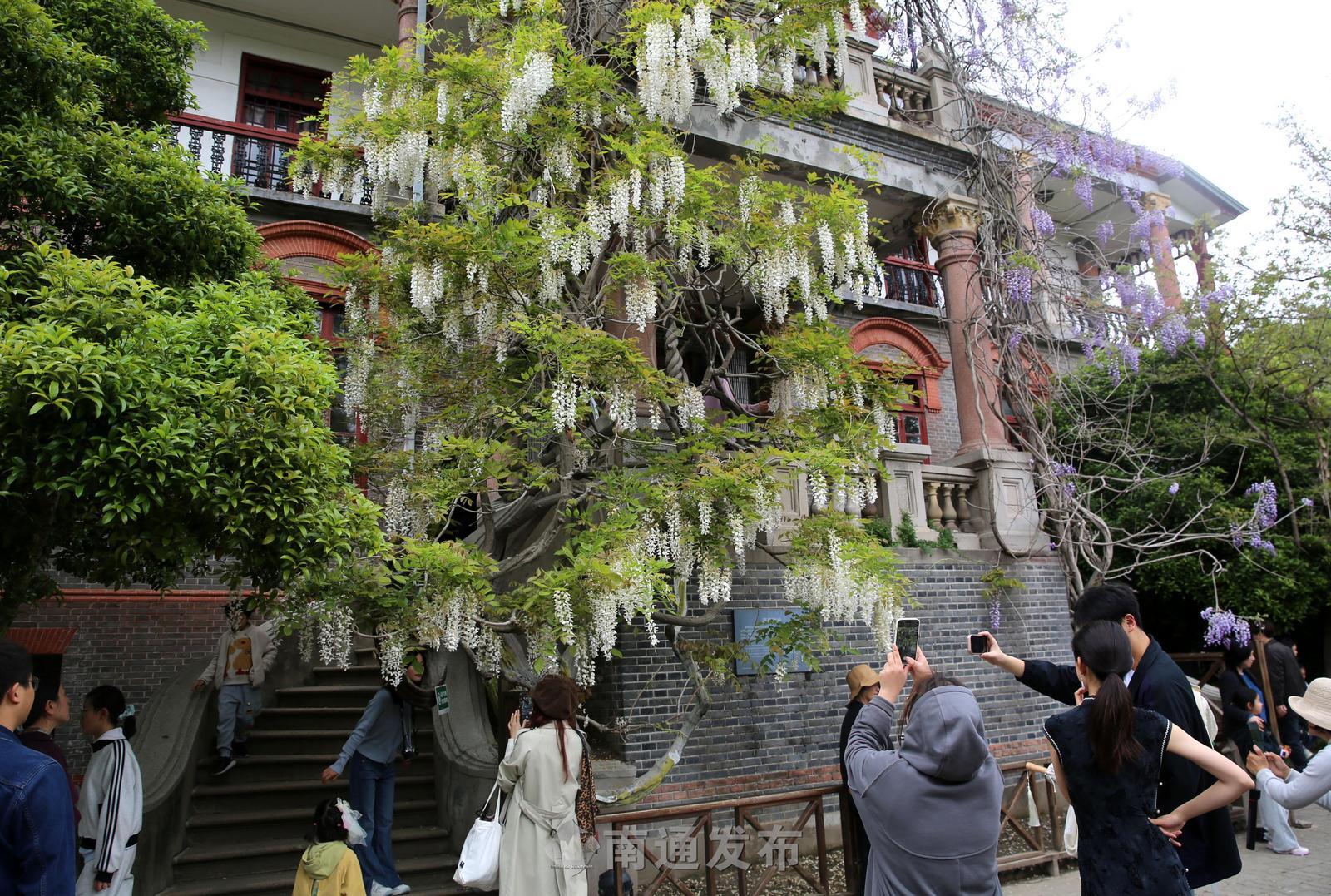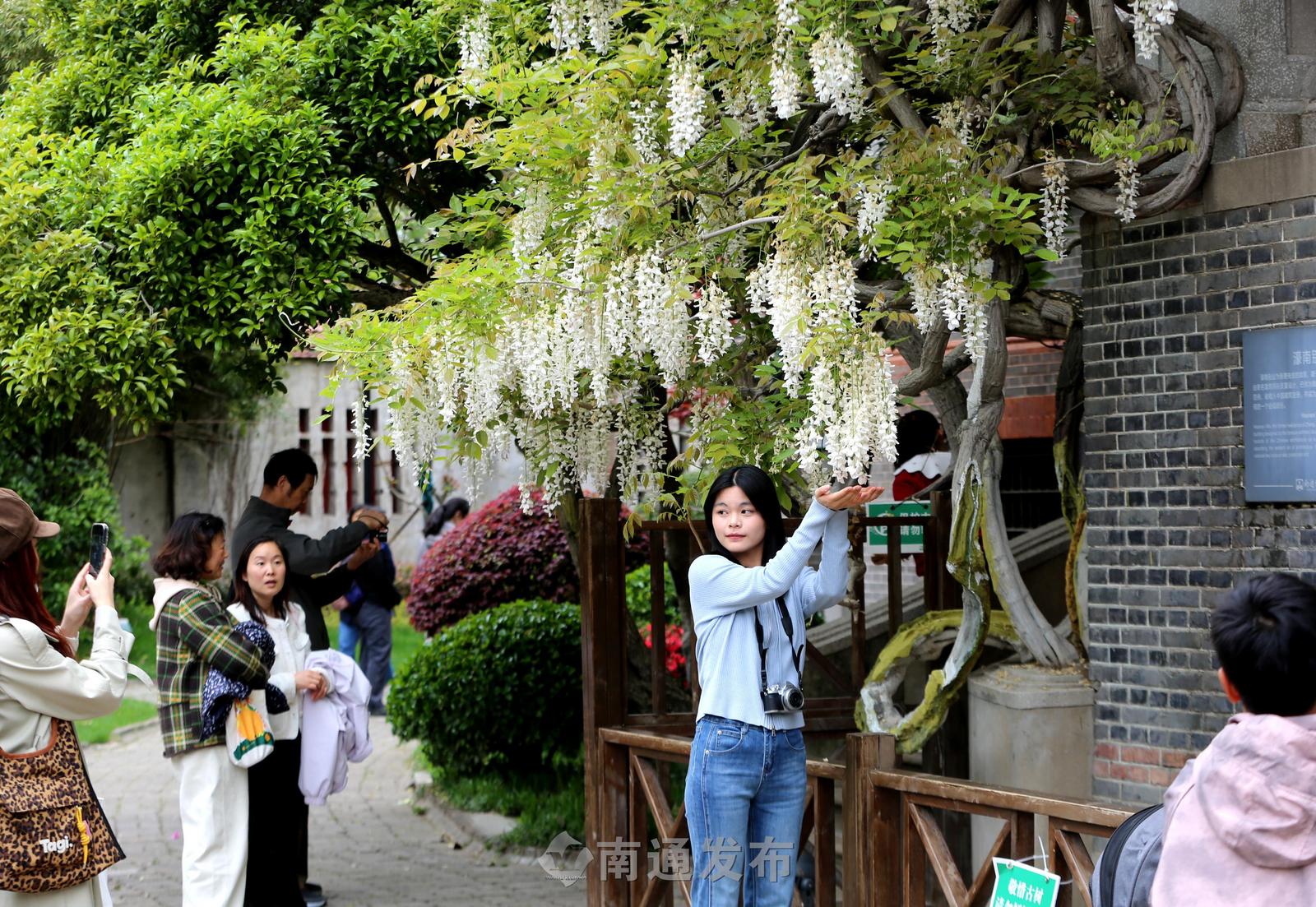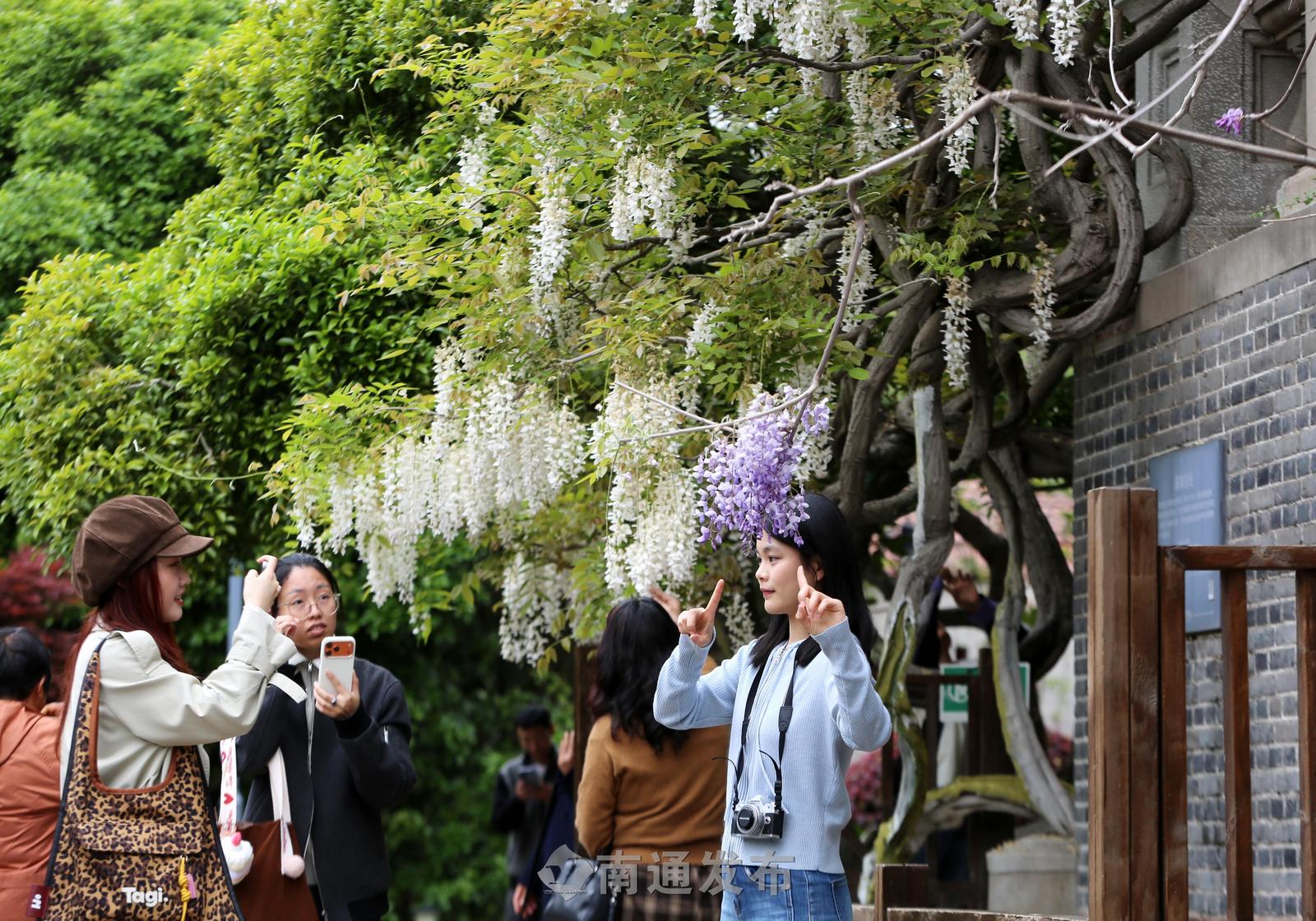 南通博物苑两株百余年树龄紫藤绽放,市民打卡留影