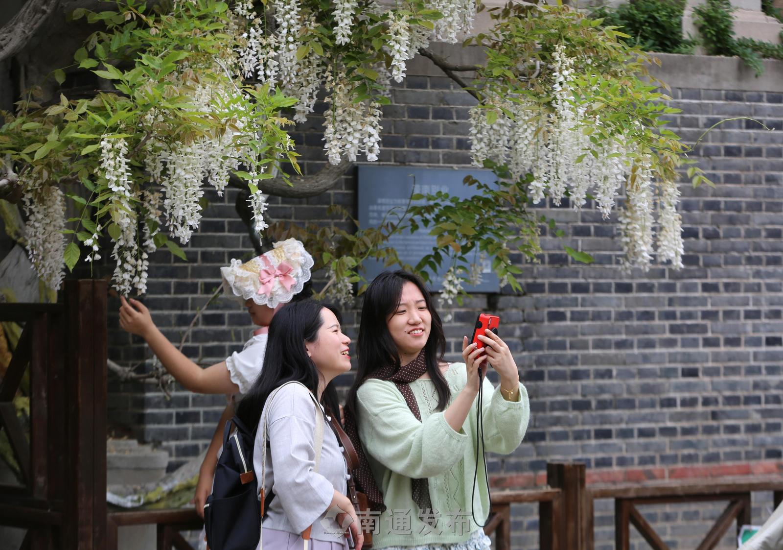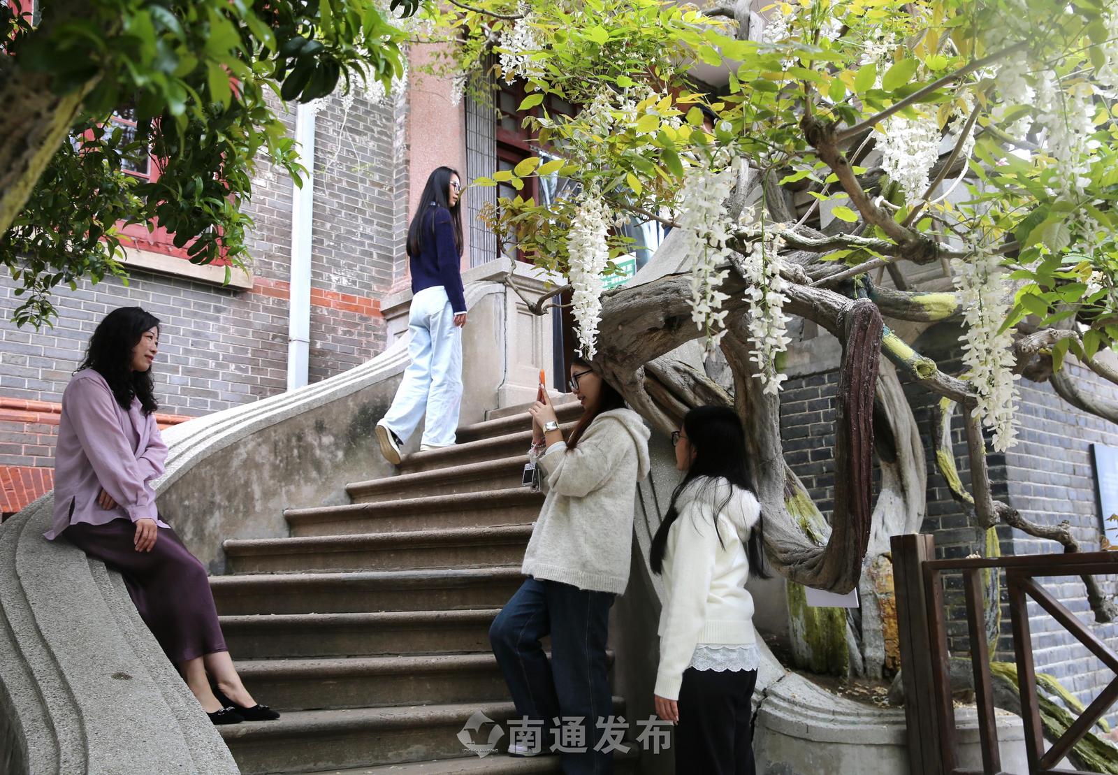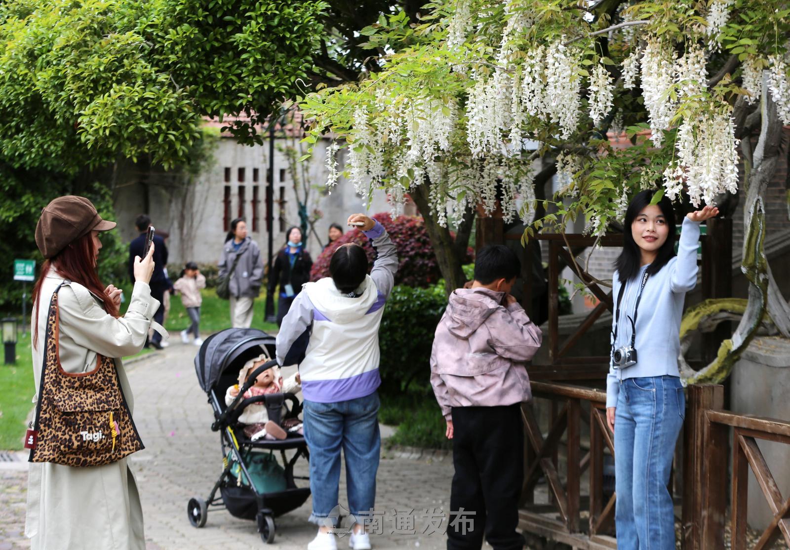 南通博物苑两株百余年树龄紫藤绽放,市民打卡留影